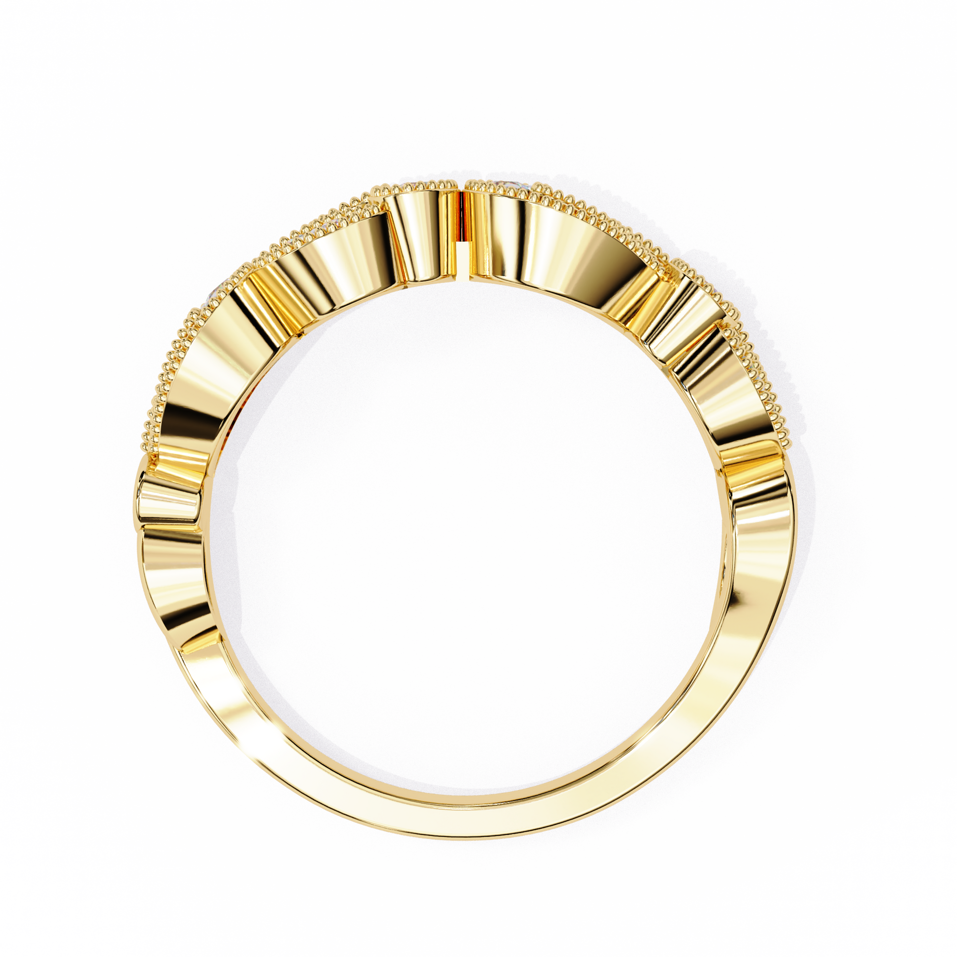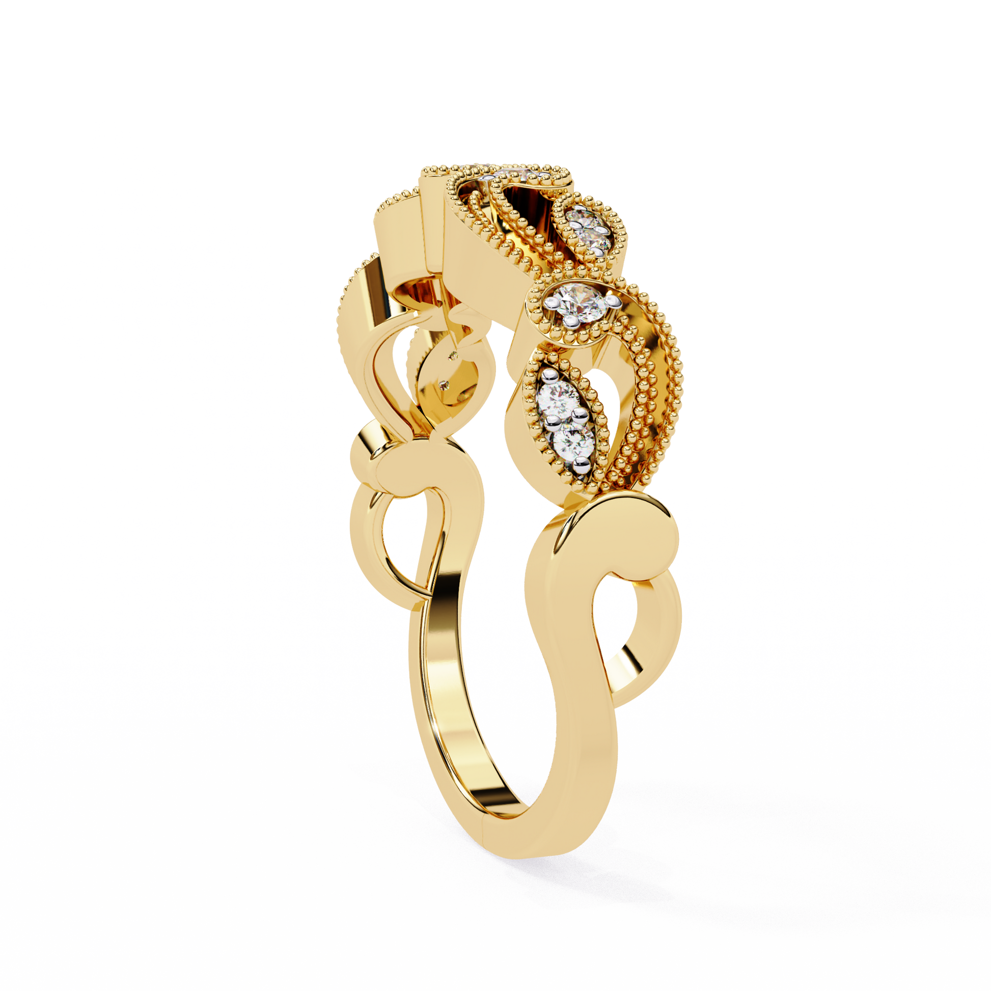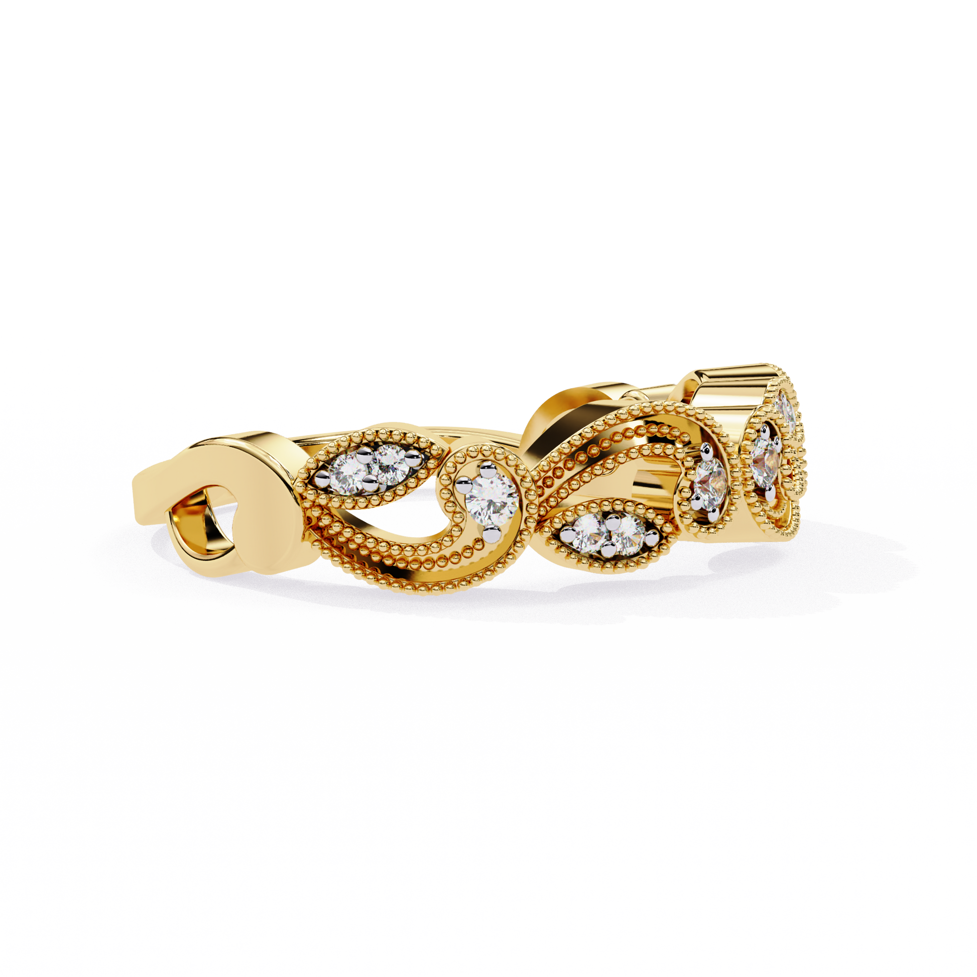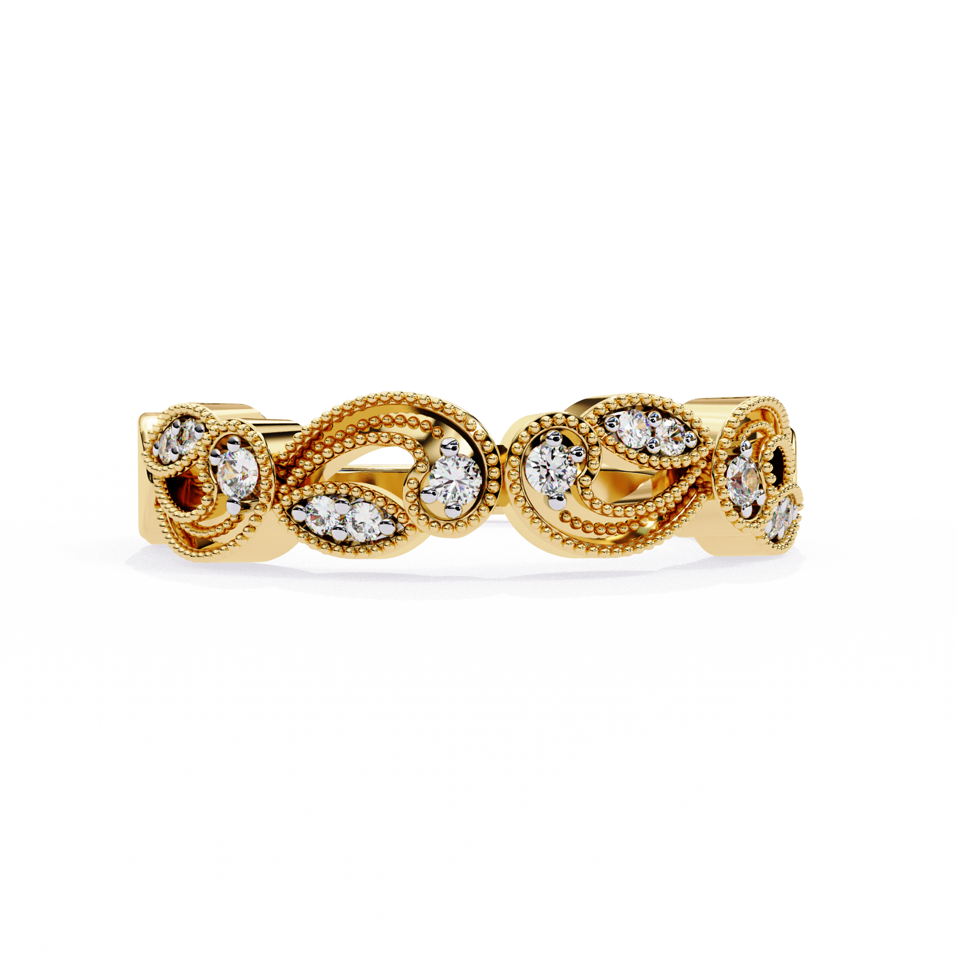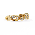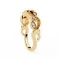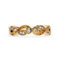 This elegant diamond band features a graceful scroll-inspired design, accented with finely set round diamonds in two complementary sizes. The flowing gold curves create a soft, vintage-inspired look, while the brilliant round diamonds add just the right amount of sparkle for everyday elegance and timeless charm.