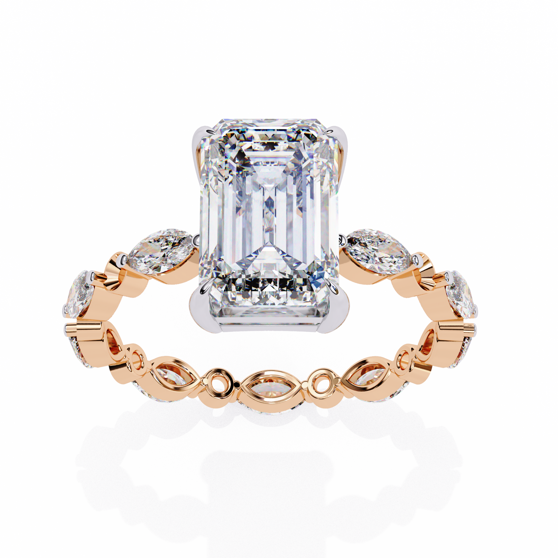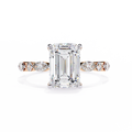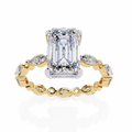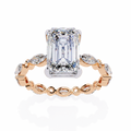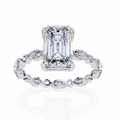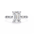 Refined and sophisticated, this exquisite engagement ring features a striking 3.00 Ct emerald cut center diamond measuring 9.50 × 7.50 mm, admired for its elegant step-cut facets and mirror-like brilliance. The elongated emerald shape delivers a timeless, high-jewelry appeal with understated luxury.