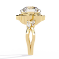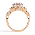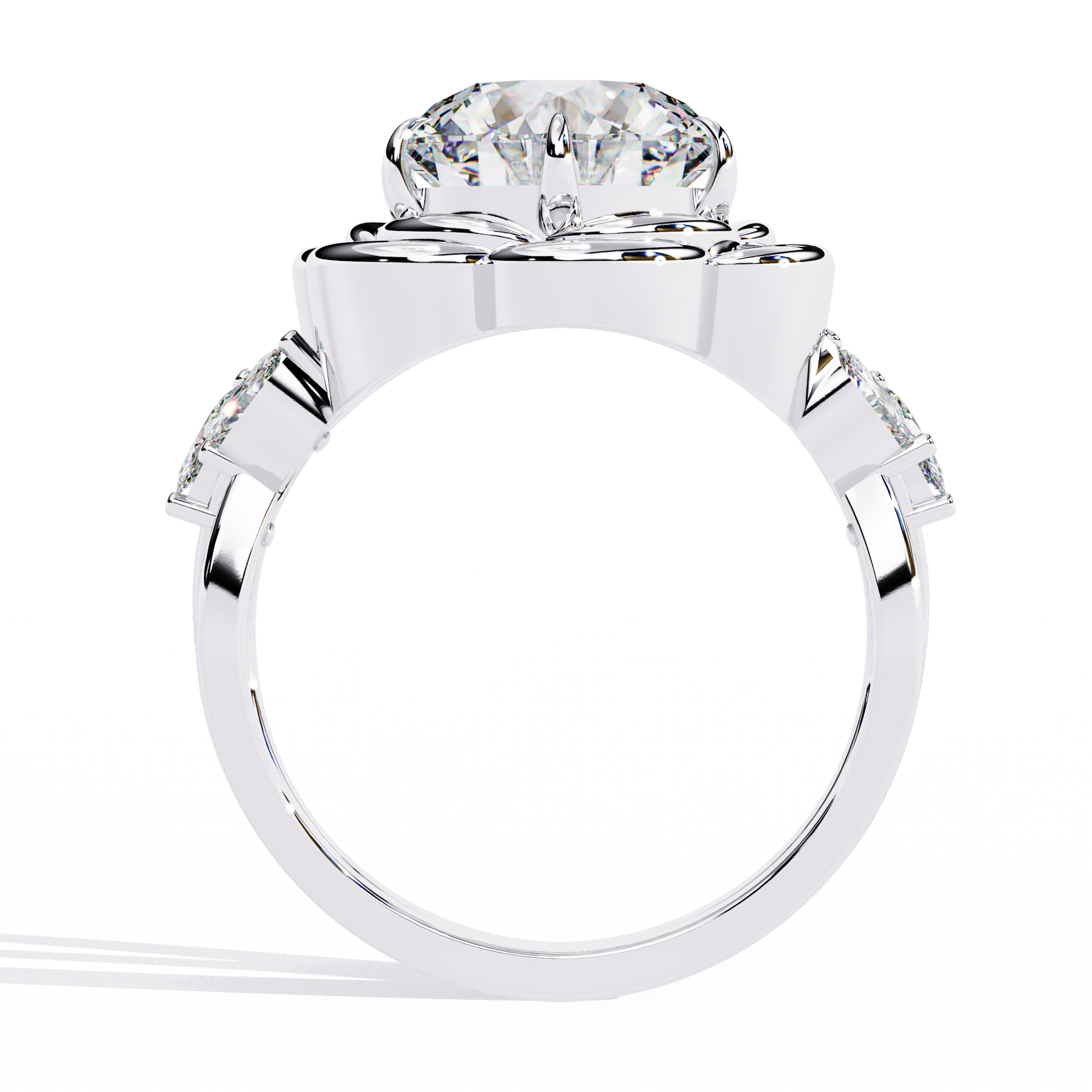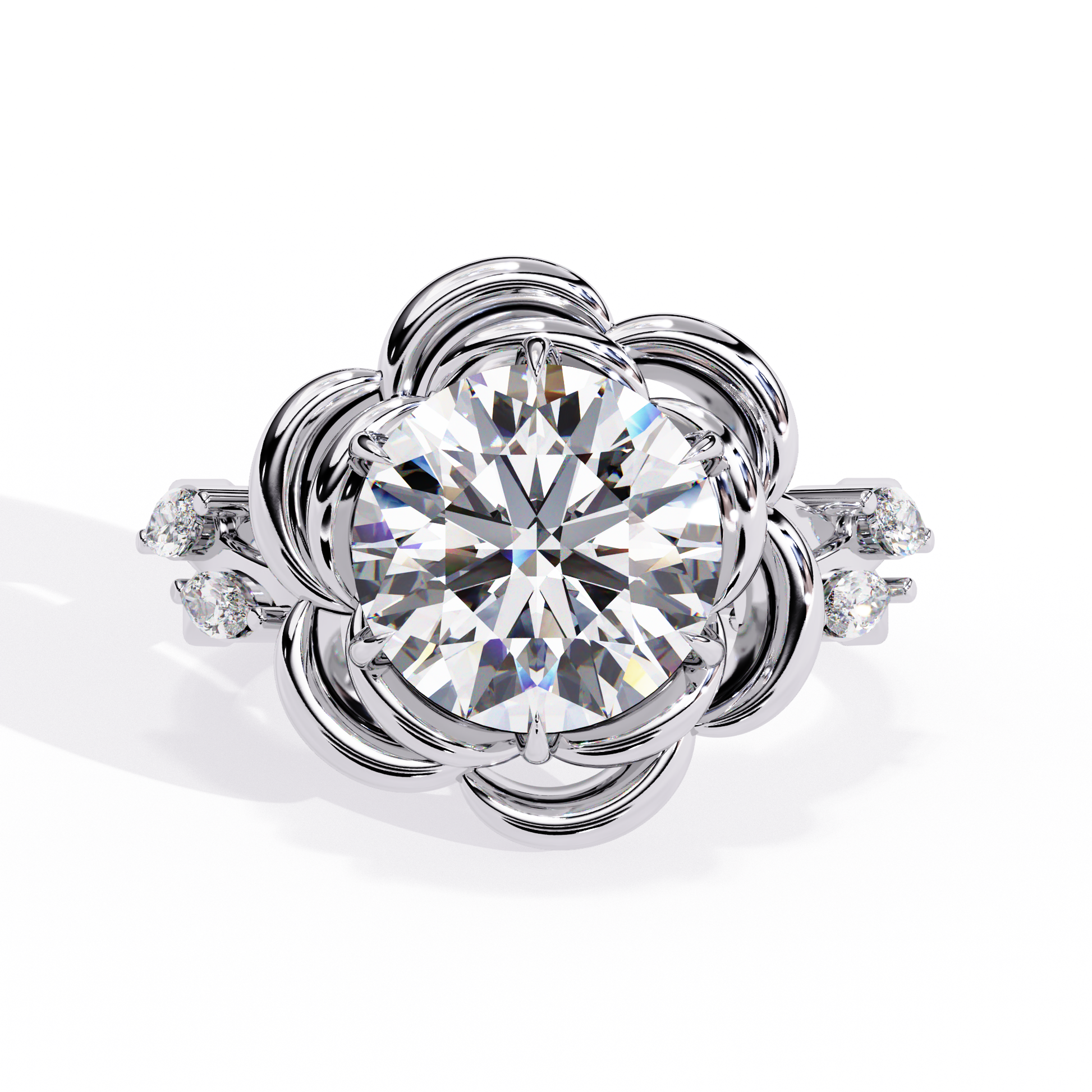 This breathtaking engagement ring features a stunning 2.00 Carat round brilliant cut center diamond, gracefully embraced by a sculpted rose-inspired setting that symbolizes love in full bloom. The flowing petal-like gold design creates depth and elegance, giving the ring a bold yet romantic presence.