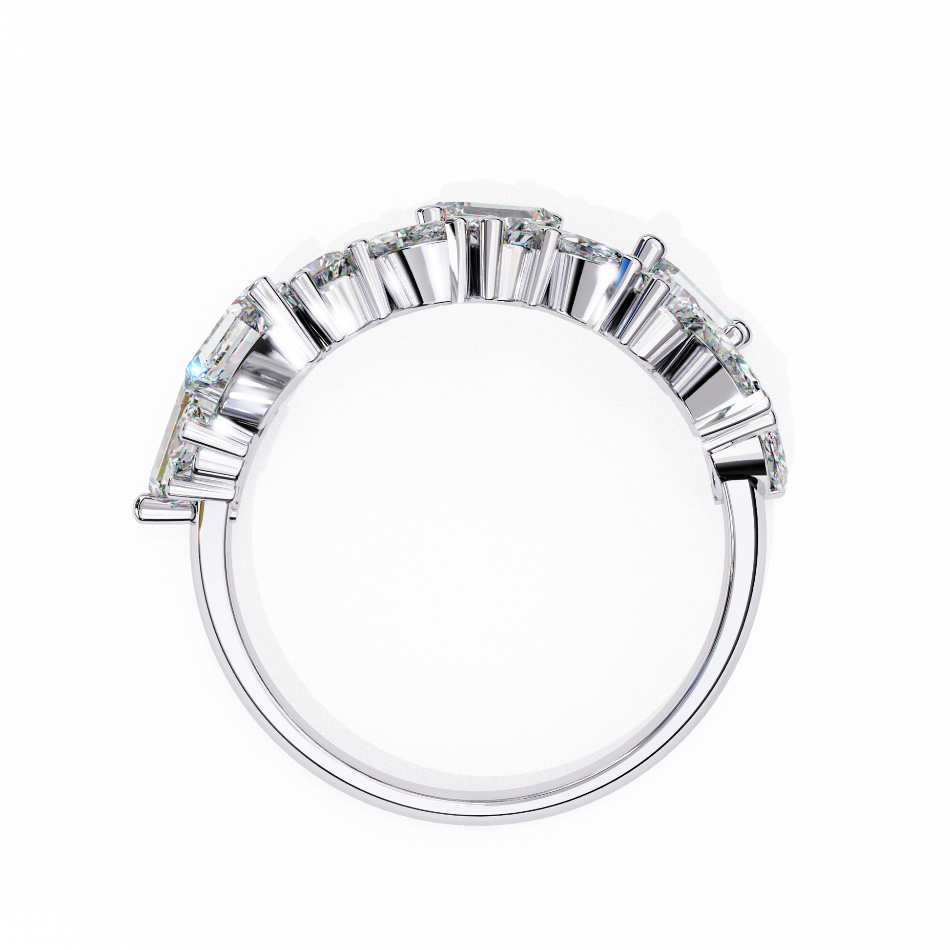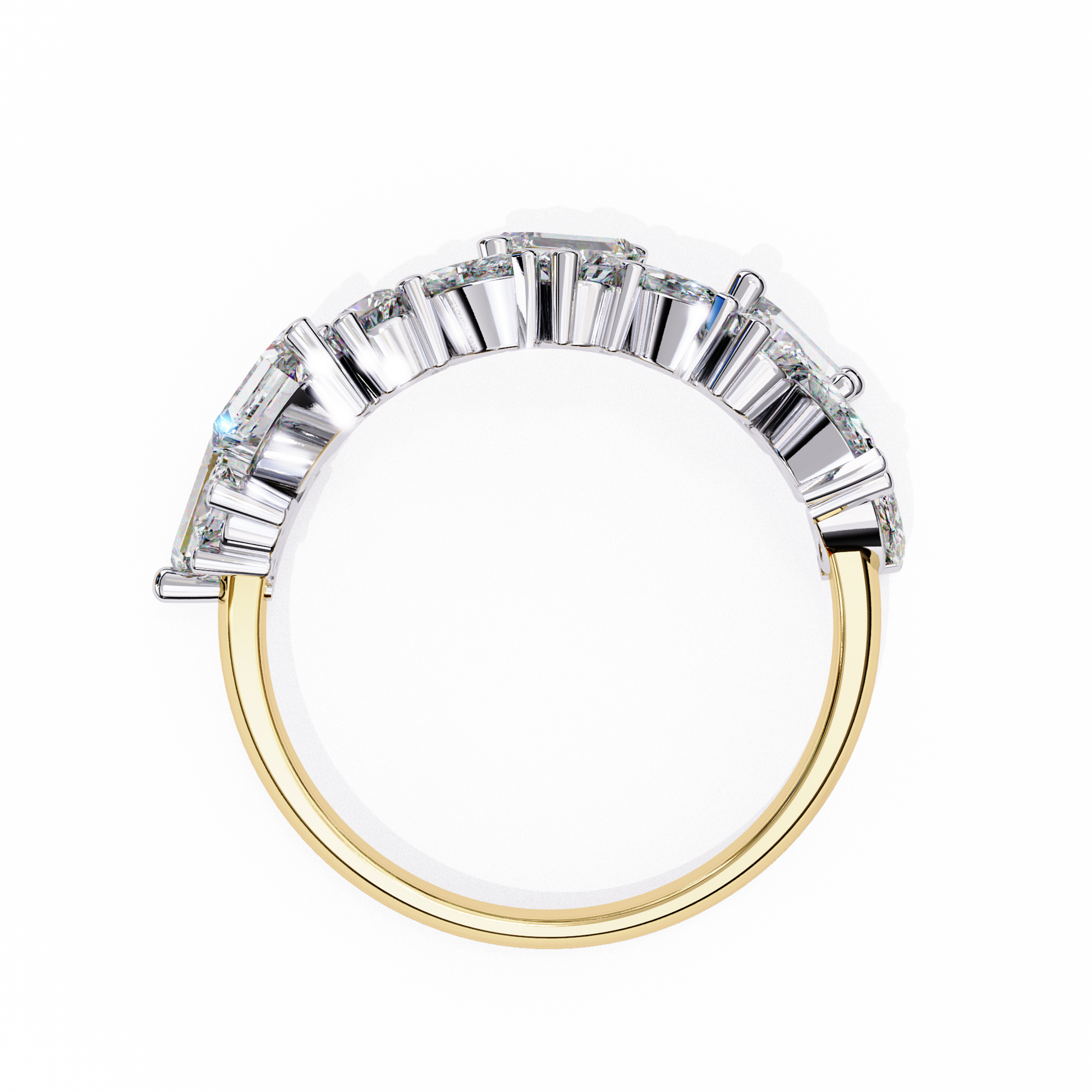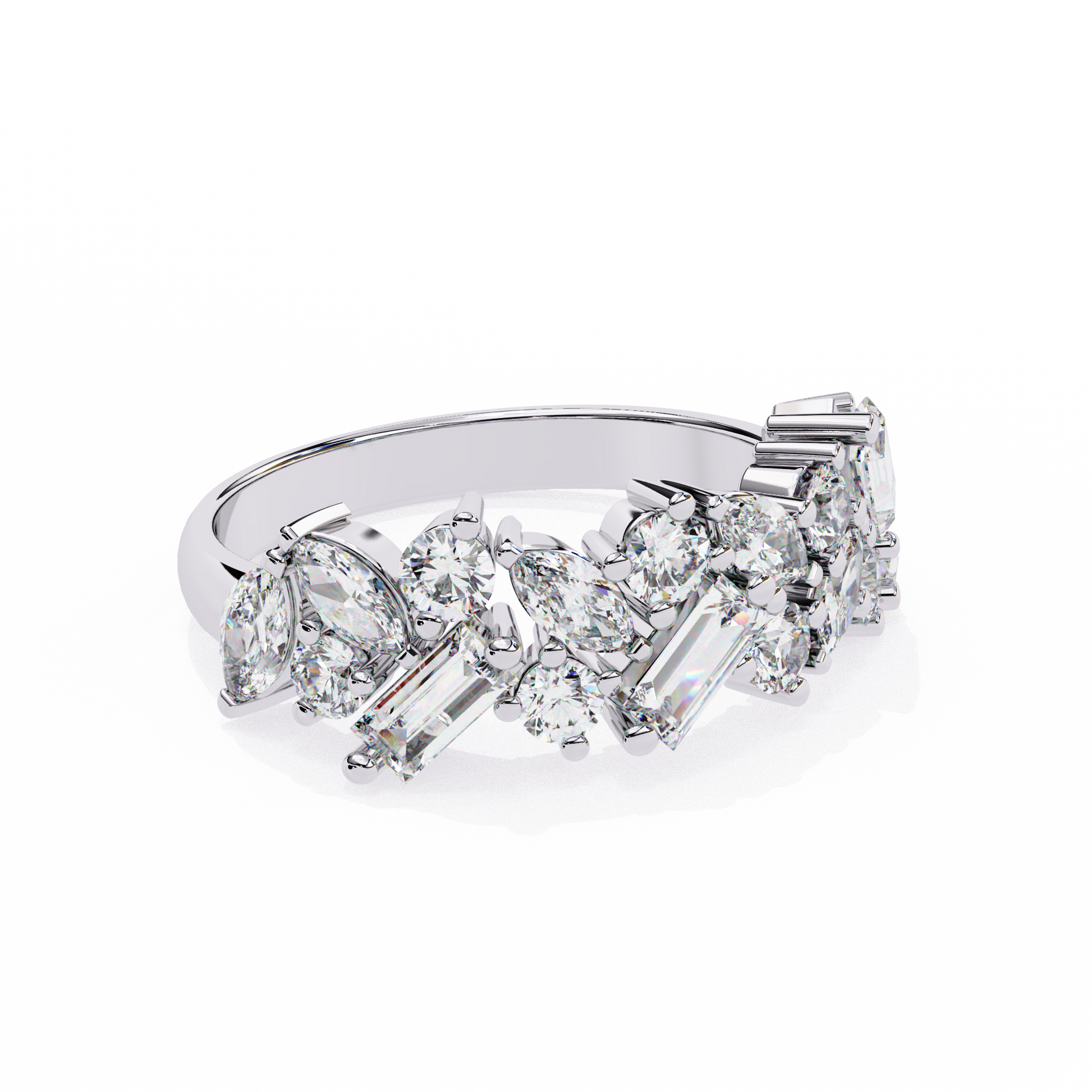 This exquisite diamond statement band features a captivating arrangement of marquise, baguette, and round diamonds, artfully set to create dimension, movement, and exceptional brilliance. The varied diamond shapes work together harmoniously, delivering a striking balance of sharp sparkle and soft fire across the band.