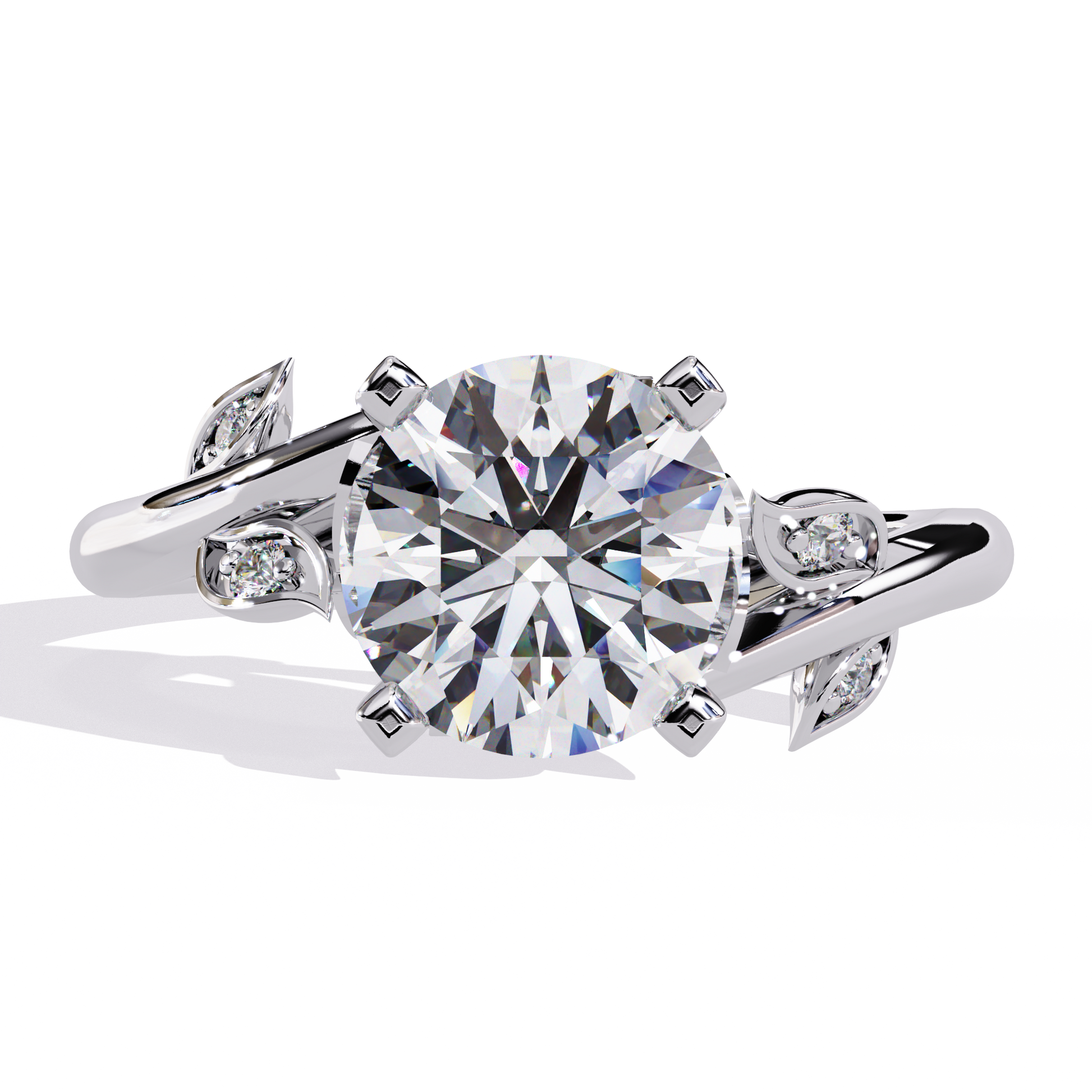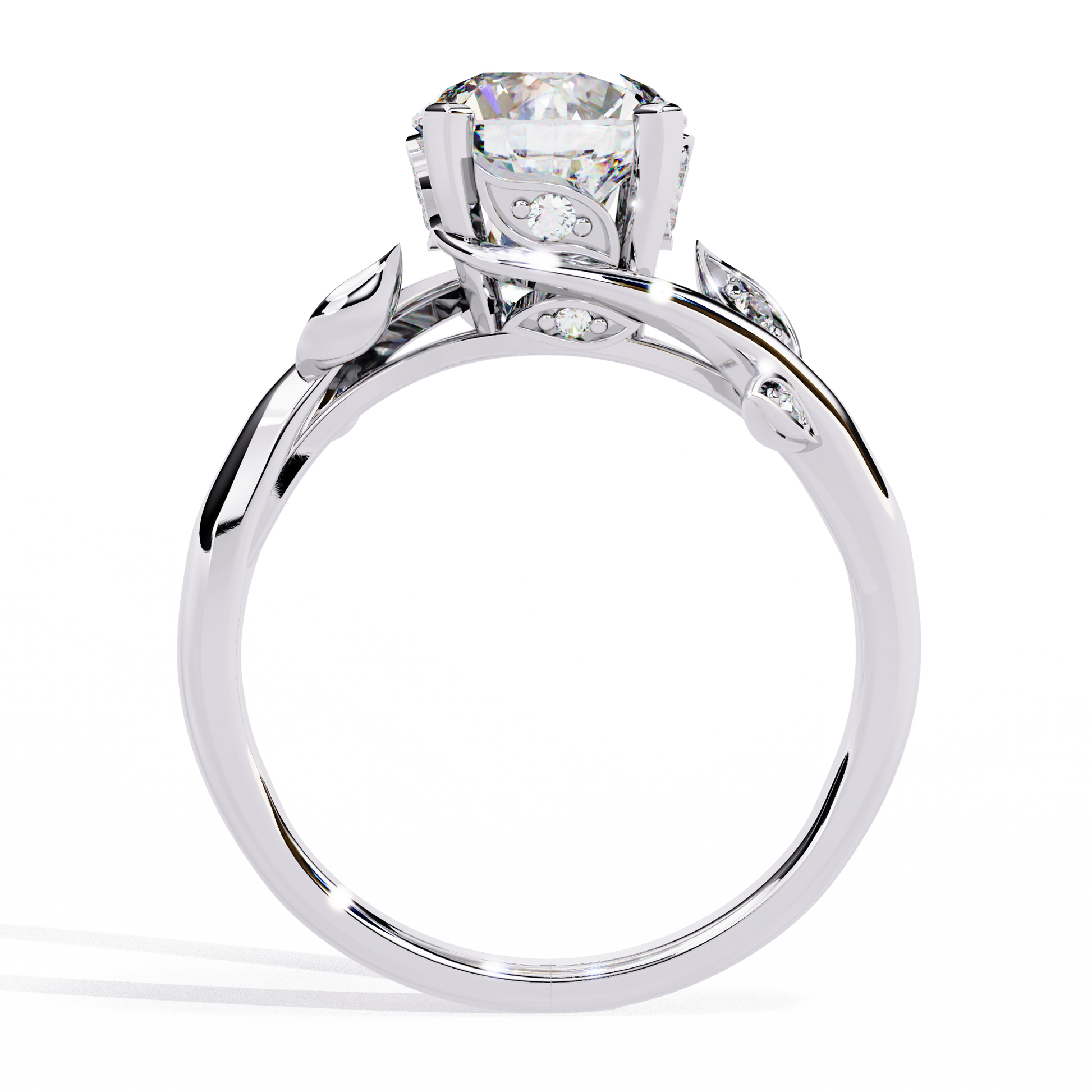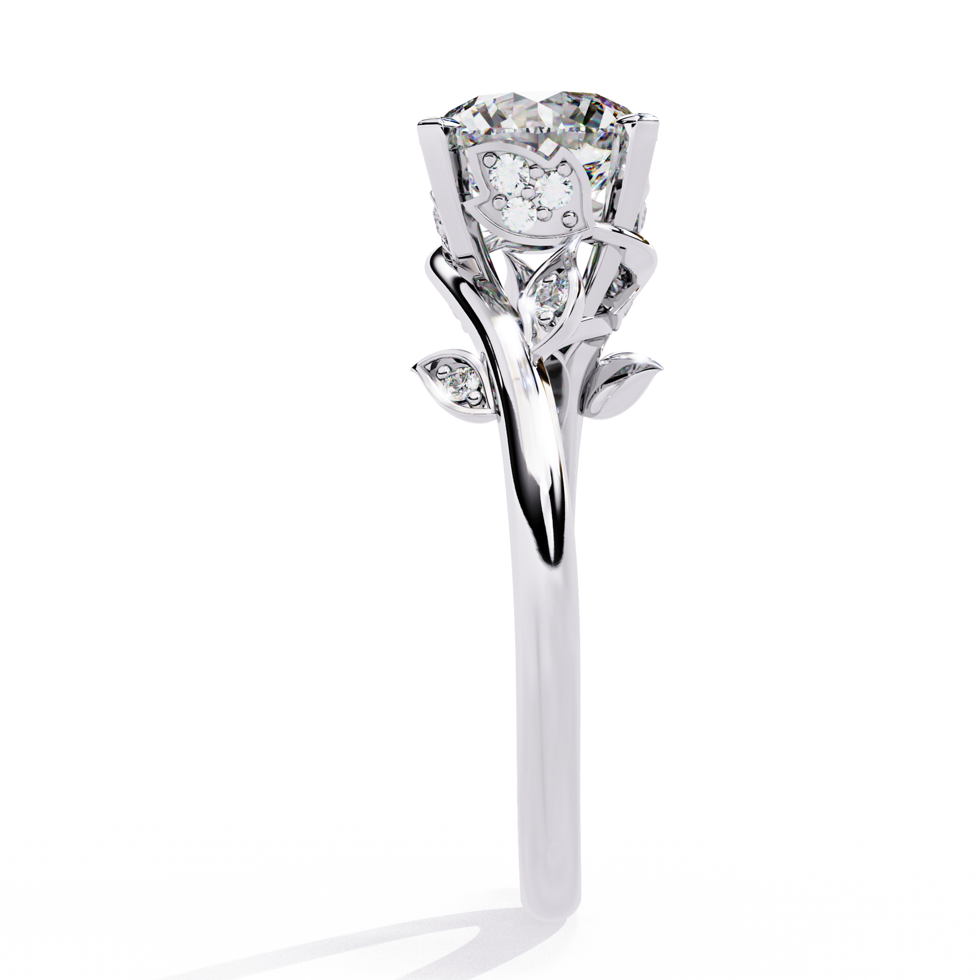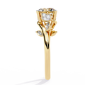 Delicate round cut side diamonds totaling 0.10 CTW are thoughtfully placed along the floral design, adding subtle sparkle without overpowering the centerpiece. The result is a graceful balance of brilliance, artistry, and timeless femininity—perfect for those who appreciate refined yet distinctive design.