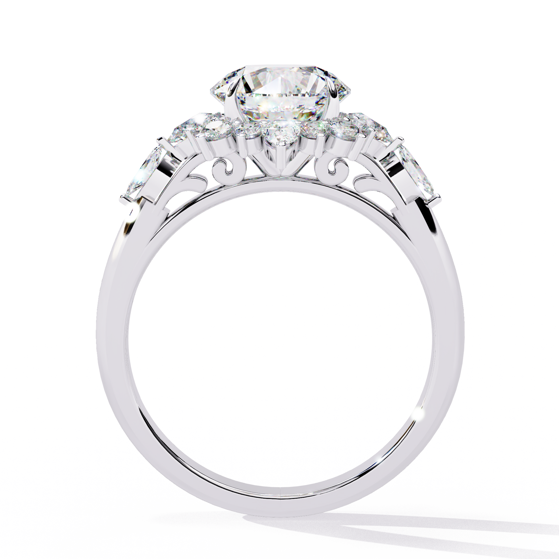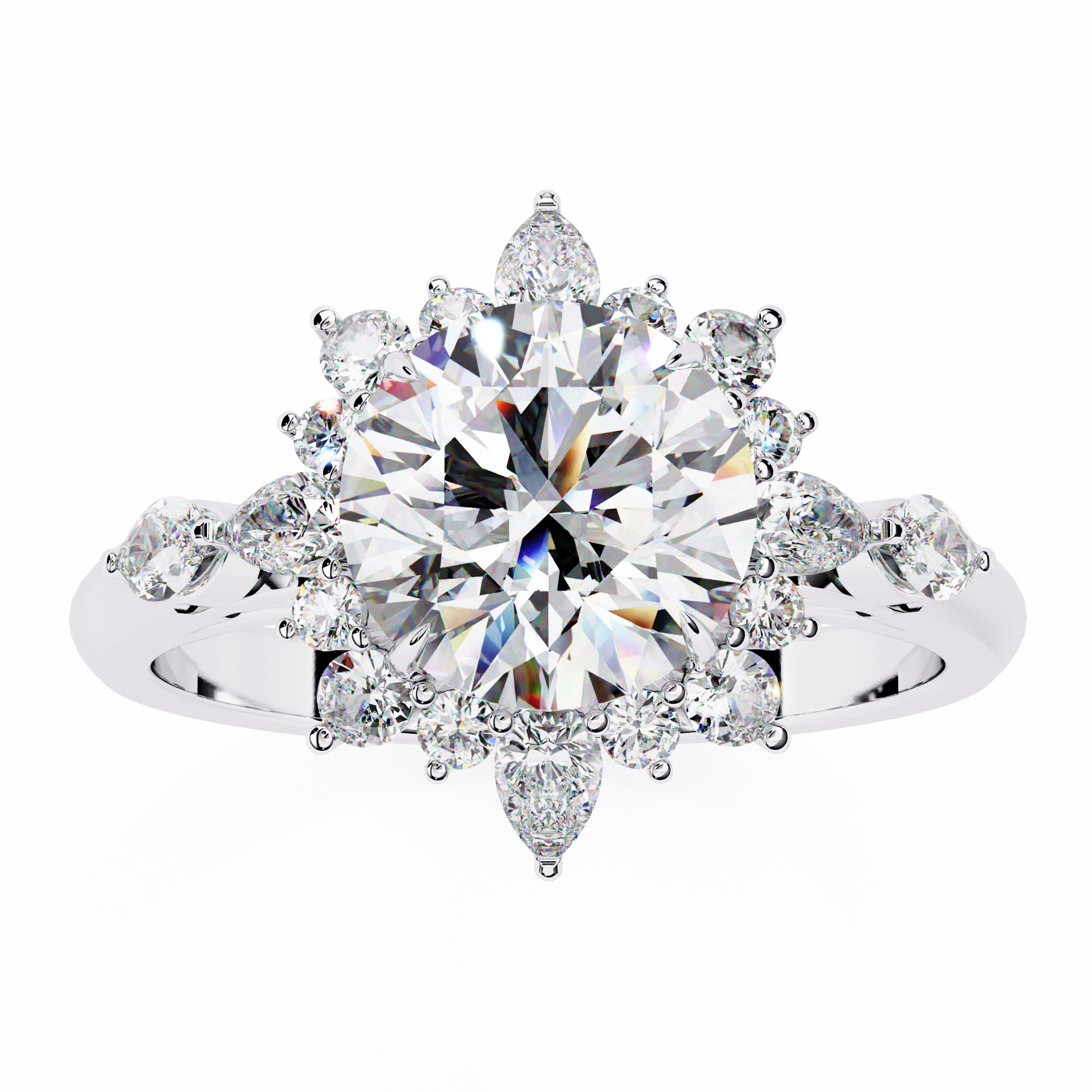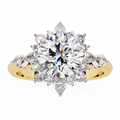 This elegant halo engagement ring features a stunning 1.50 carat round brilliant center diamond, beautifully framed by a delicate halo of pear and round diamonds. The classic round silhouette paired with soft pear accents creates a radiant floral-inspired halo, enhancing brilliance from every angle while maintaining timeless sophistication.