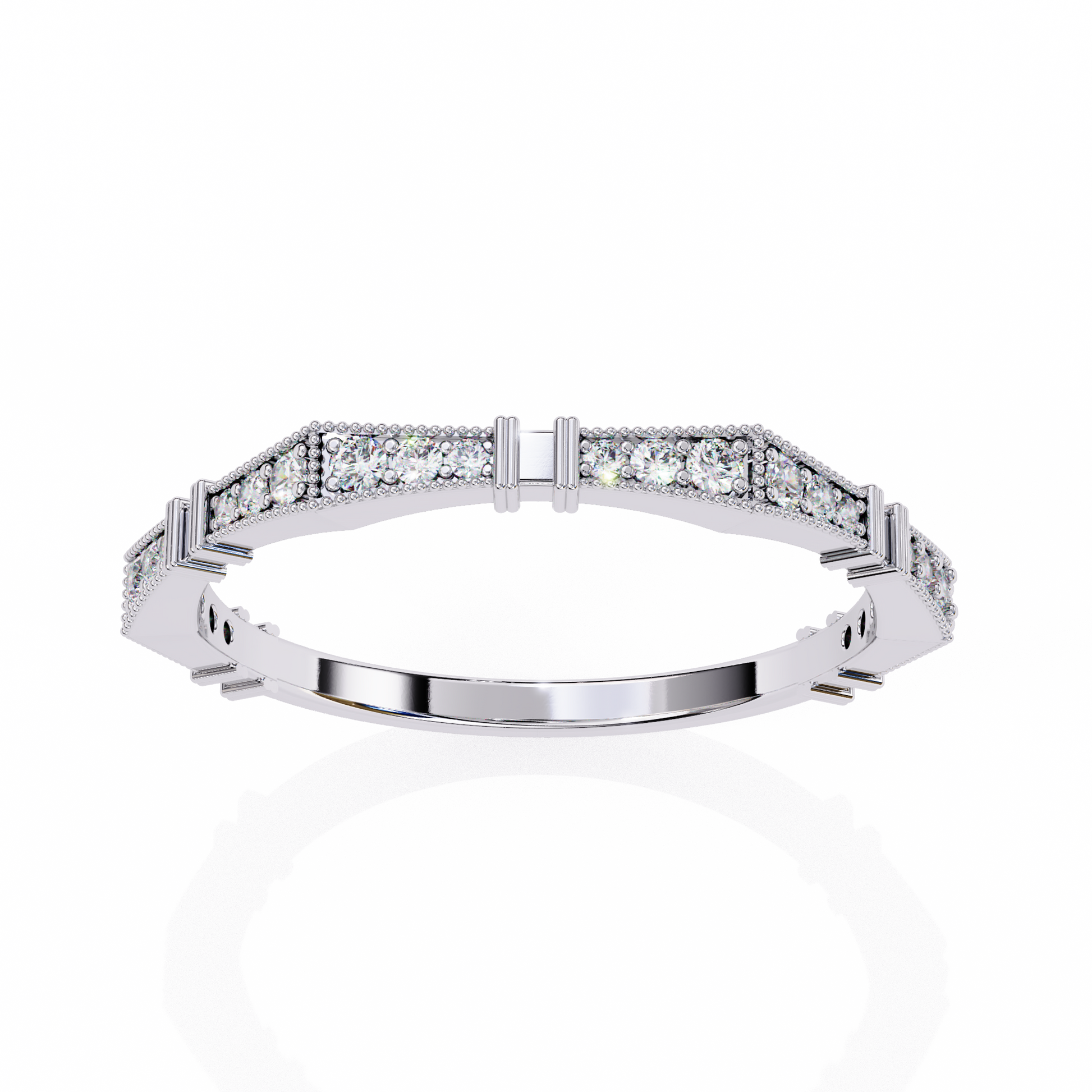 This elegant diamond band features a classic straight silhouette enhanced with delicate milgrain detailing and a refined row of small round diamonds set neatly across the band. The subtle texture along the edges adds depth and character while preserving a clean, timeless look.