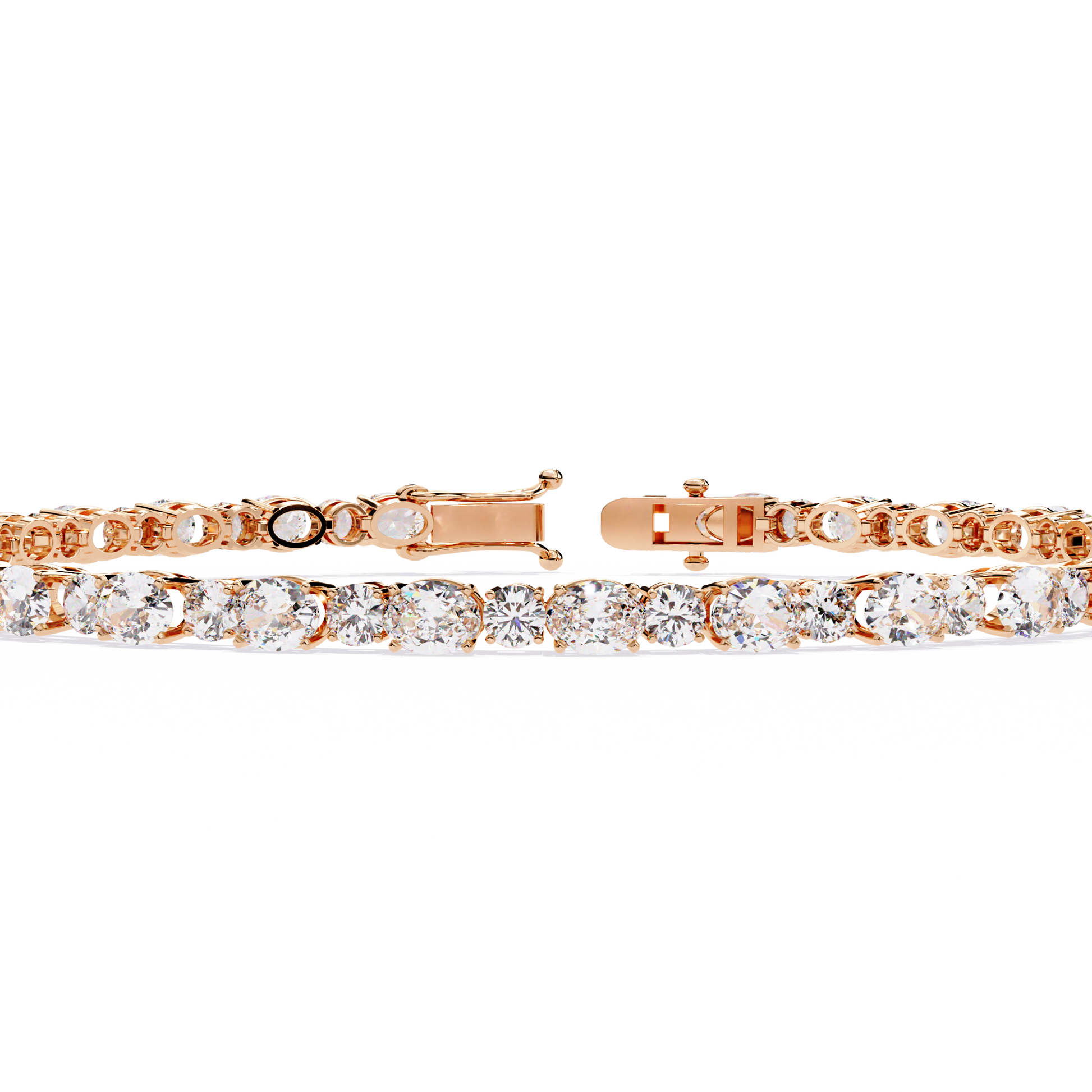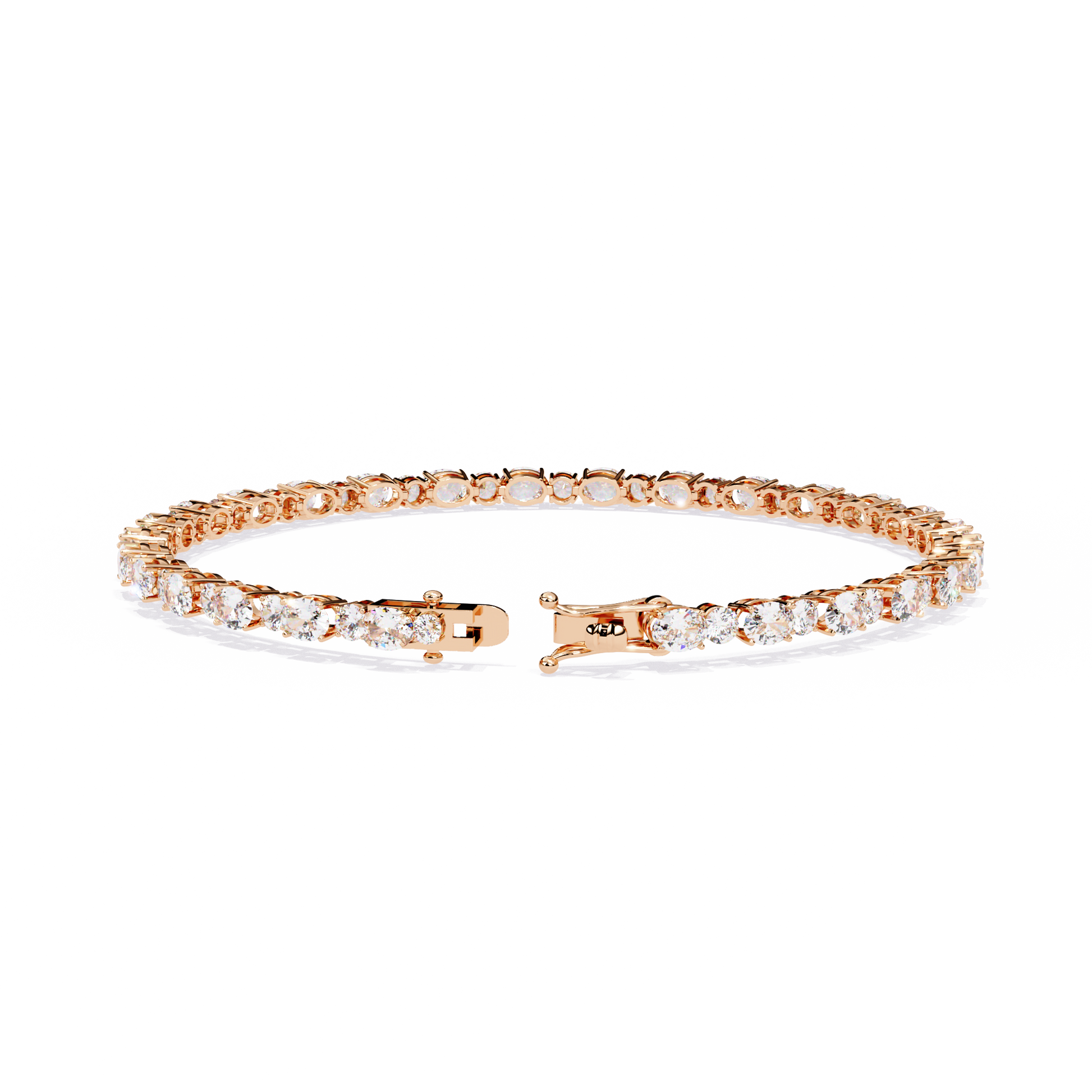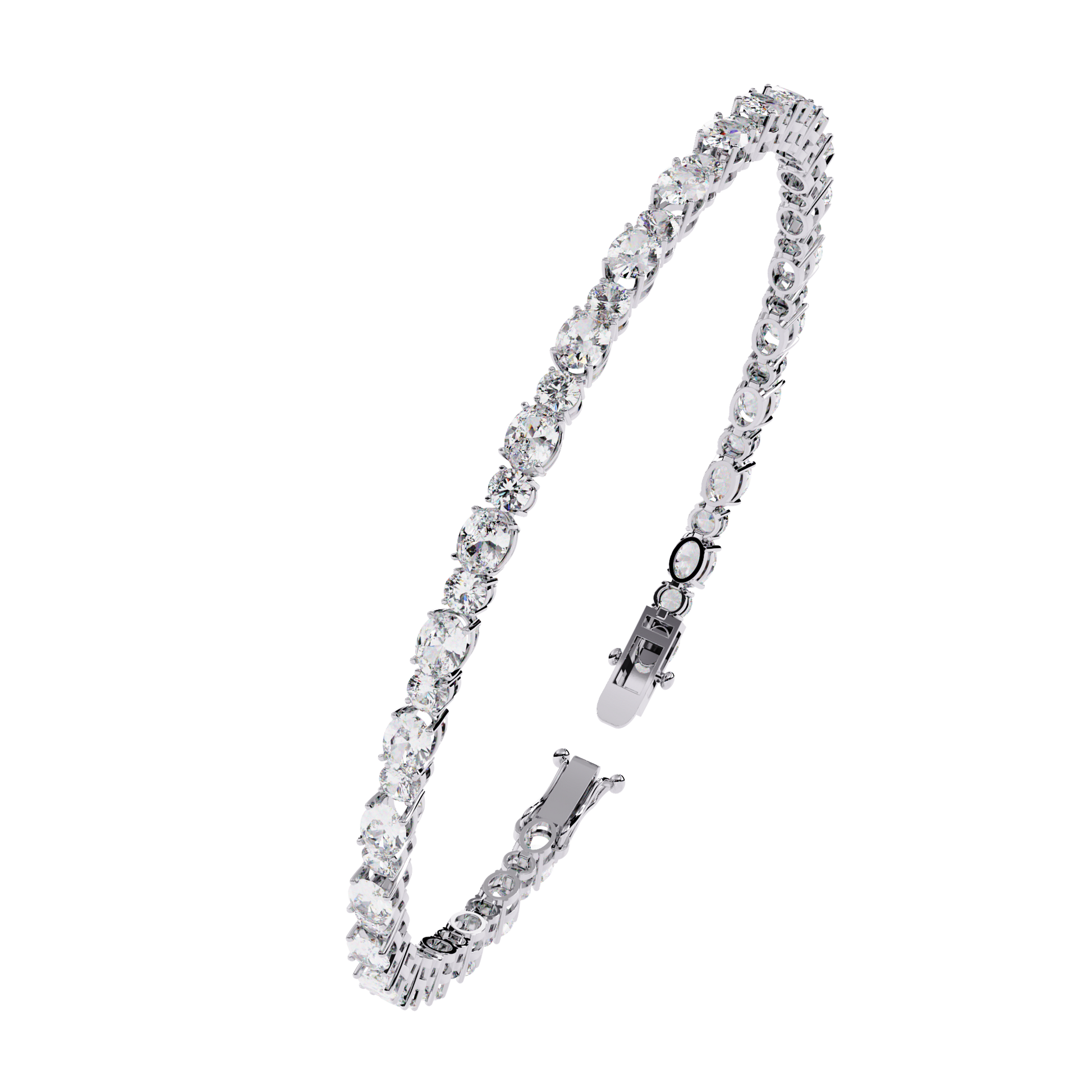 A refined combination of oval and round diamonds set in a seamless tennis pattern, offering continuous brilliance across the wrist. The alternating shapes enhance light reflection, creating a sophisticated and eye-catching sparkle — perfect for both special occasions and luxury everyday wear.