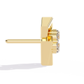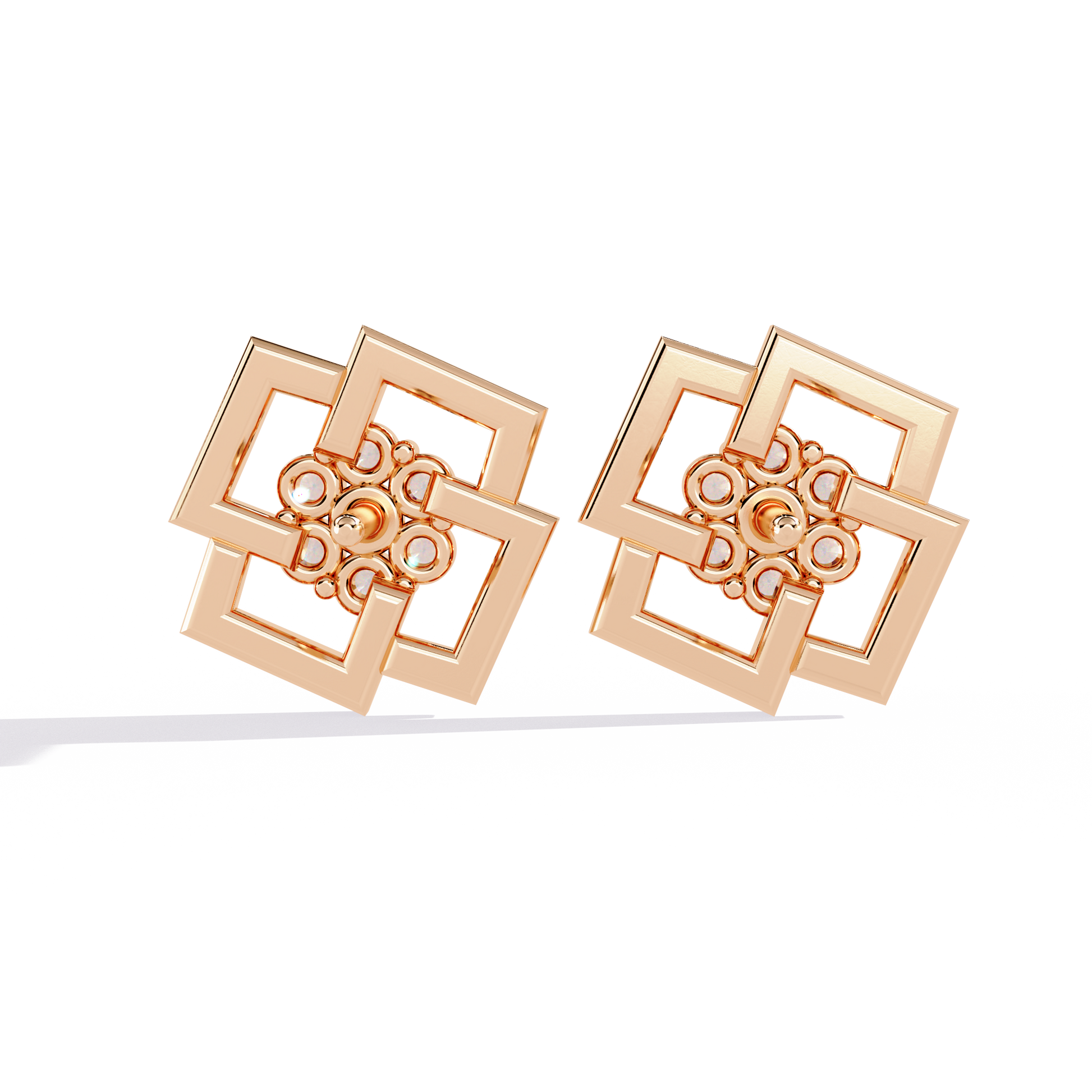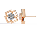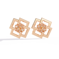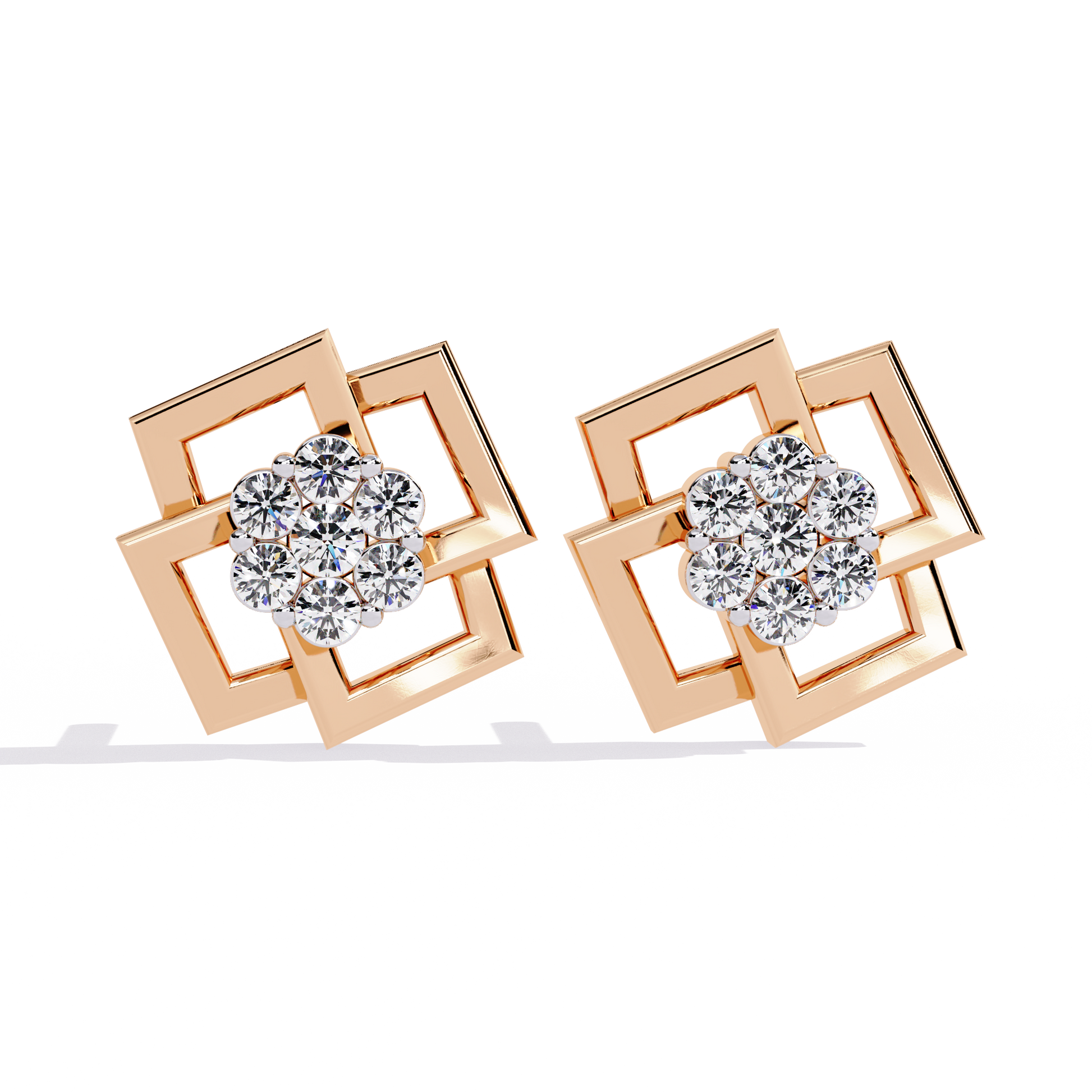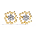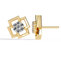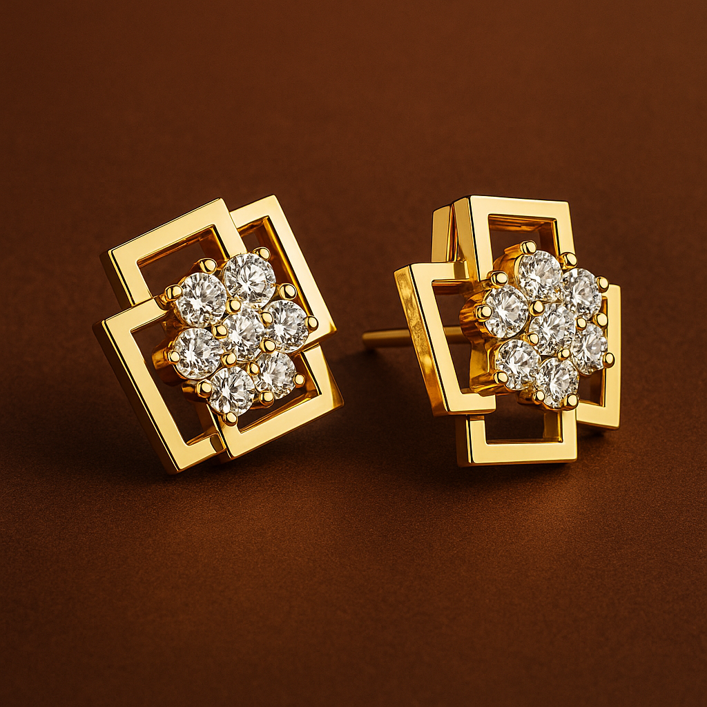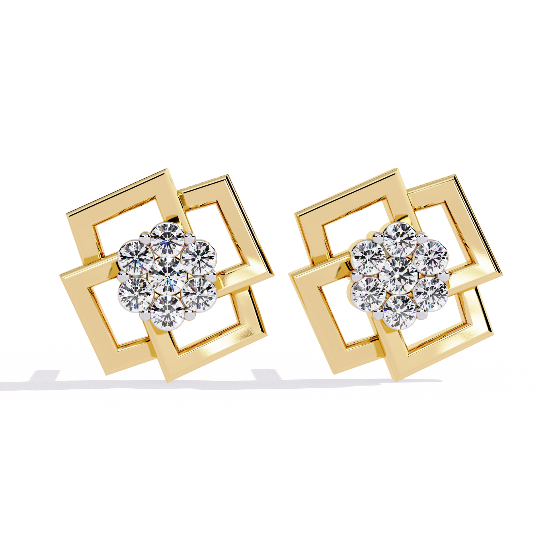 A bold statement of modern geometry, these designer studs feature a captivating interlocking square motif in high-polish gold. At the center of this architectural frame lies a brilliant cluster of round diamonds, meticulously set to create a focal point of intense radiance and contemporary charm.