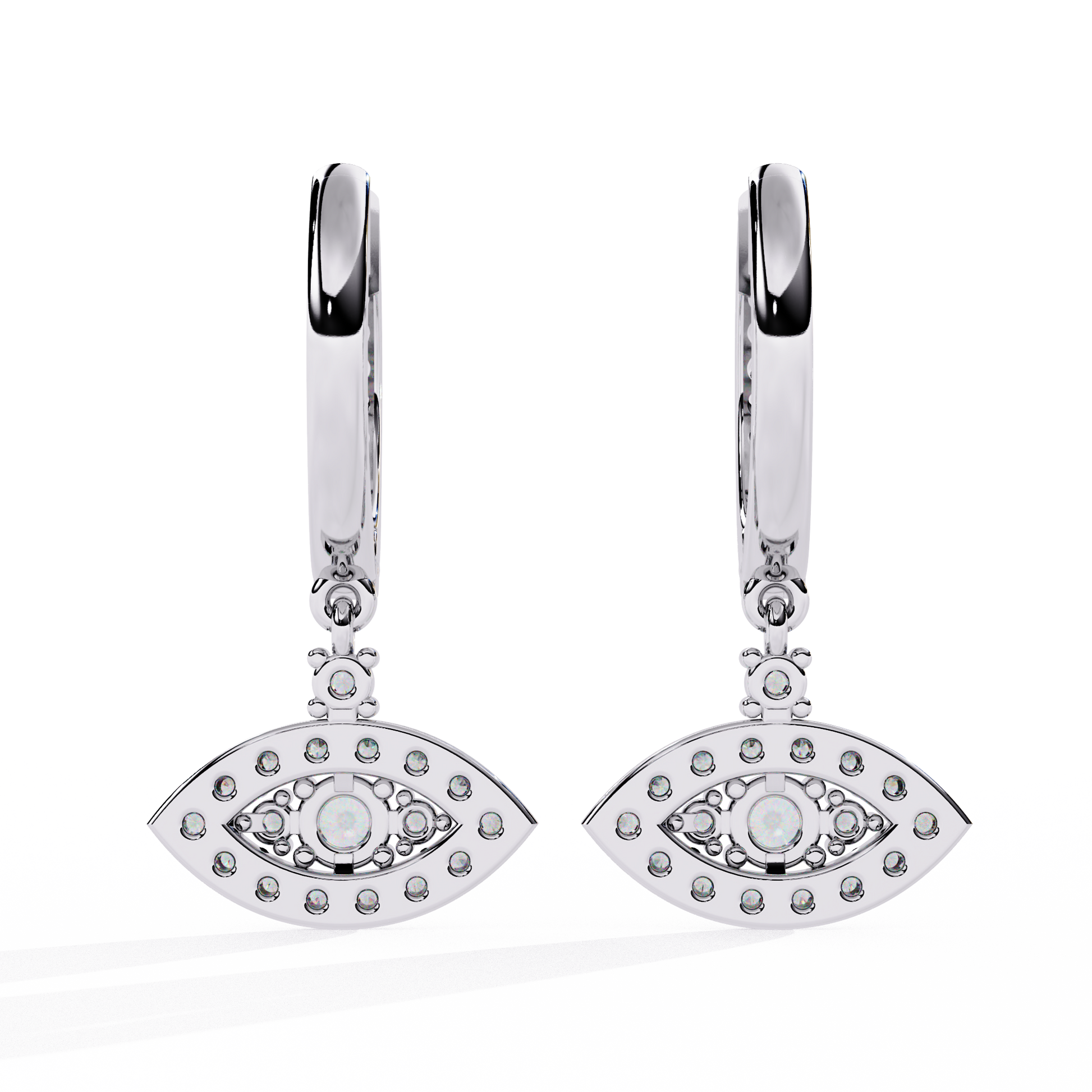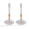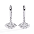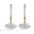 A protective talisman reimagined in high-luxury, these designer hoop earrings feature a captivating evil eye drop. A brilliant round center diamond acts as the iris, surrounded by a double halo of pavé-set diamonds that form the iconic almond shape. Suspended from sleek, diamond-encrusted huggie hoops, this piece blends ancient symbolism with contemporary glamour.