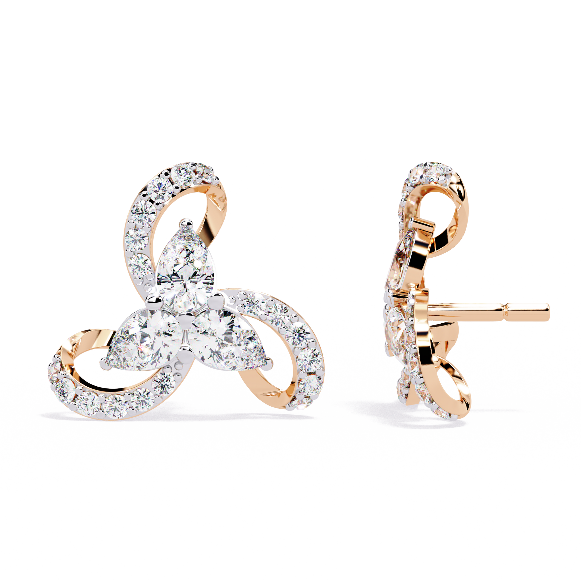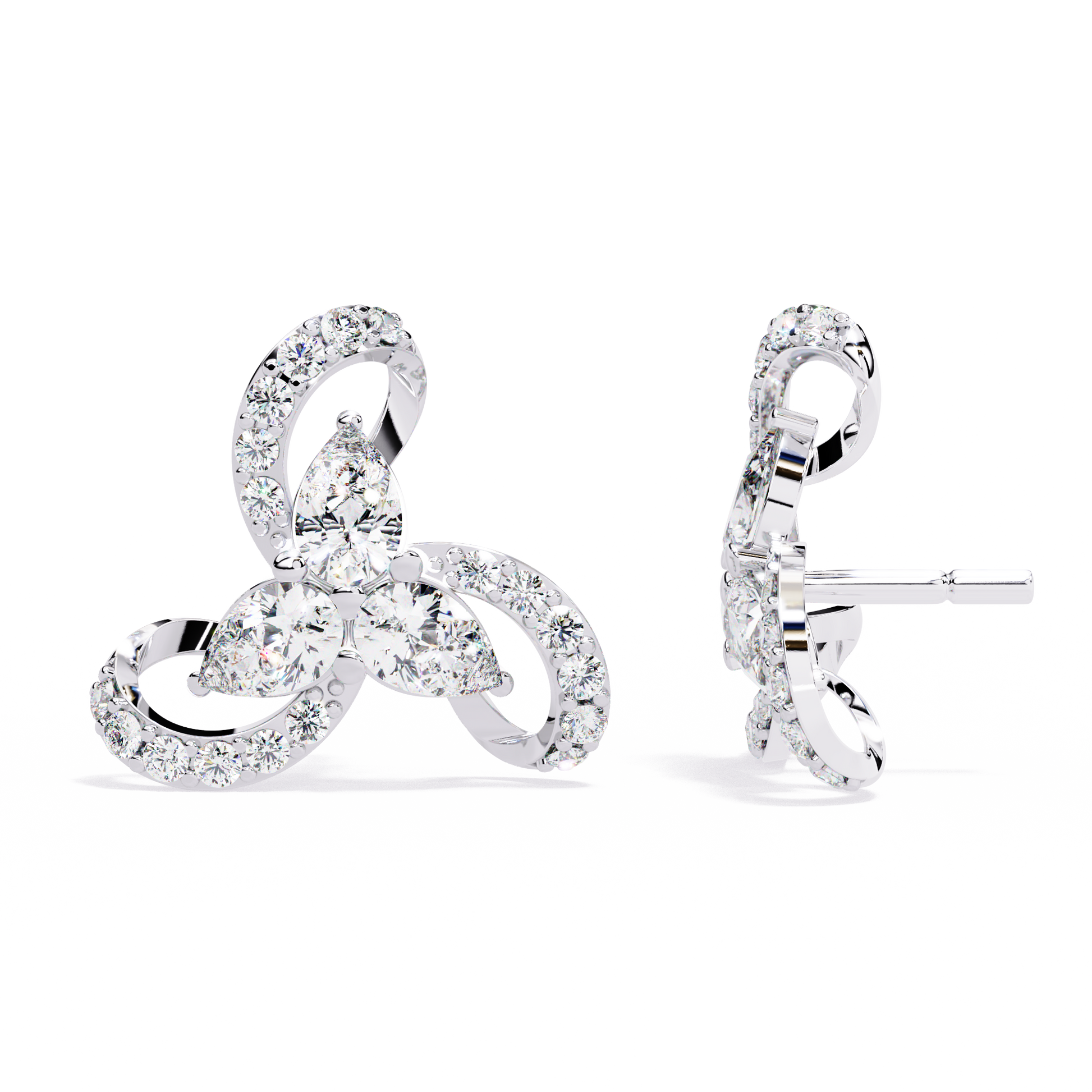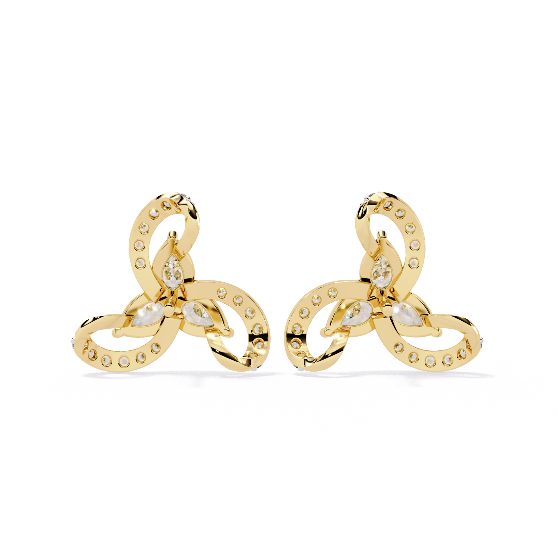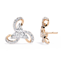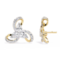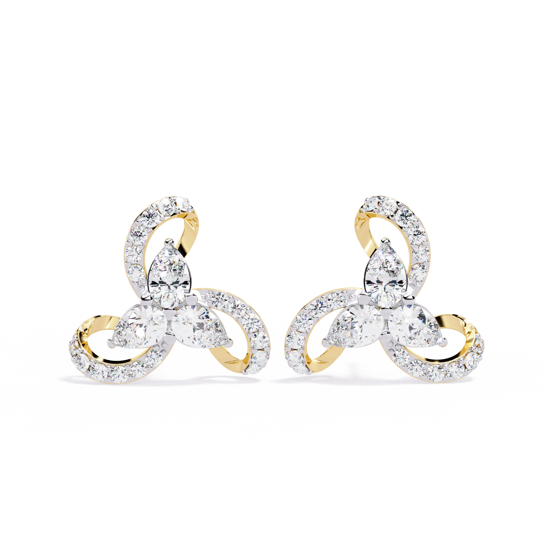 A breathtaking floral-inspired design, these luxury earrings feature a central cluster of three pear-shaped diamonds arranged in a delicate trillium formation. Each petal is embraced by a fluid, swirling gold ribbon adorned with shimmering round brilliant diamonds, creating a sense of graceful, perpetual motion.