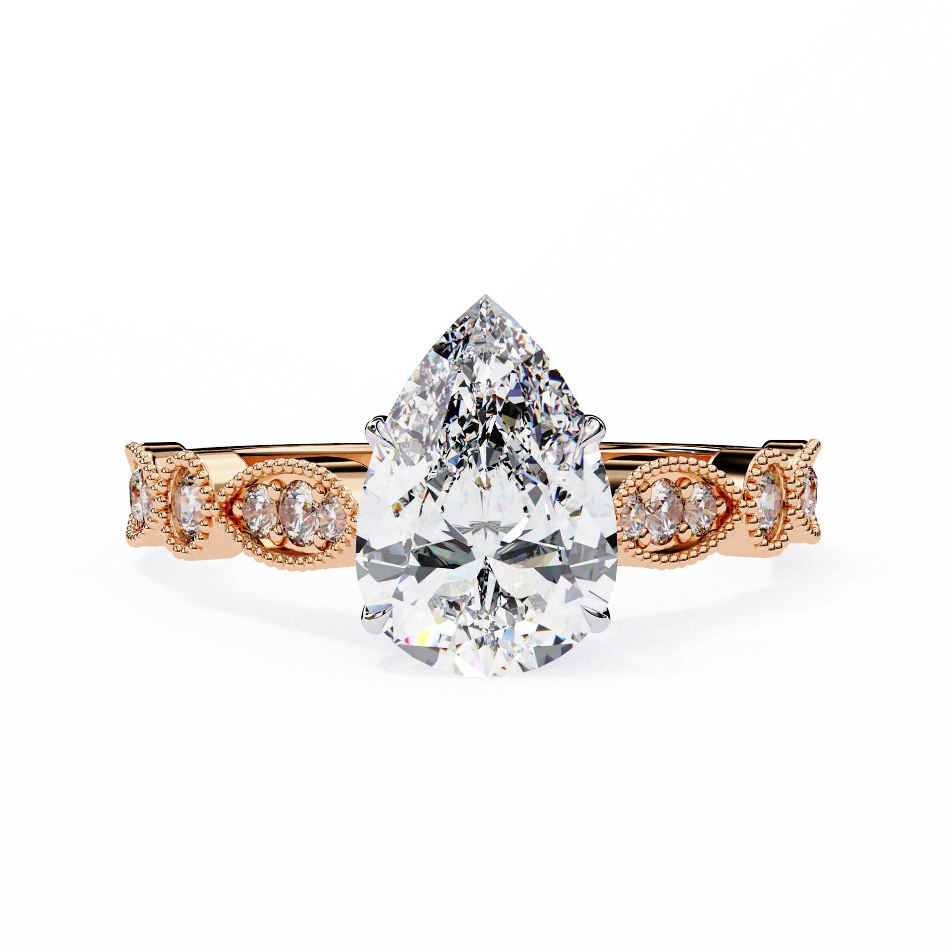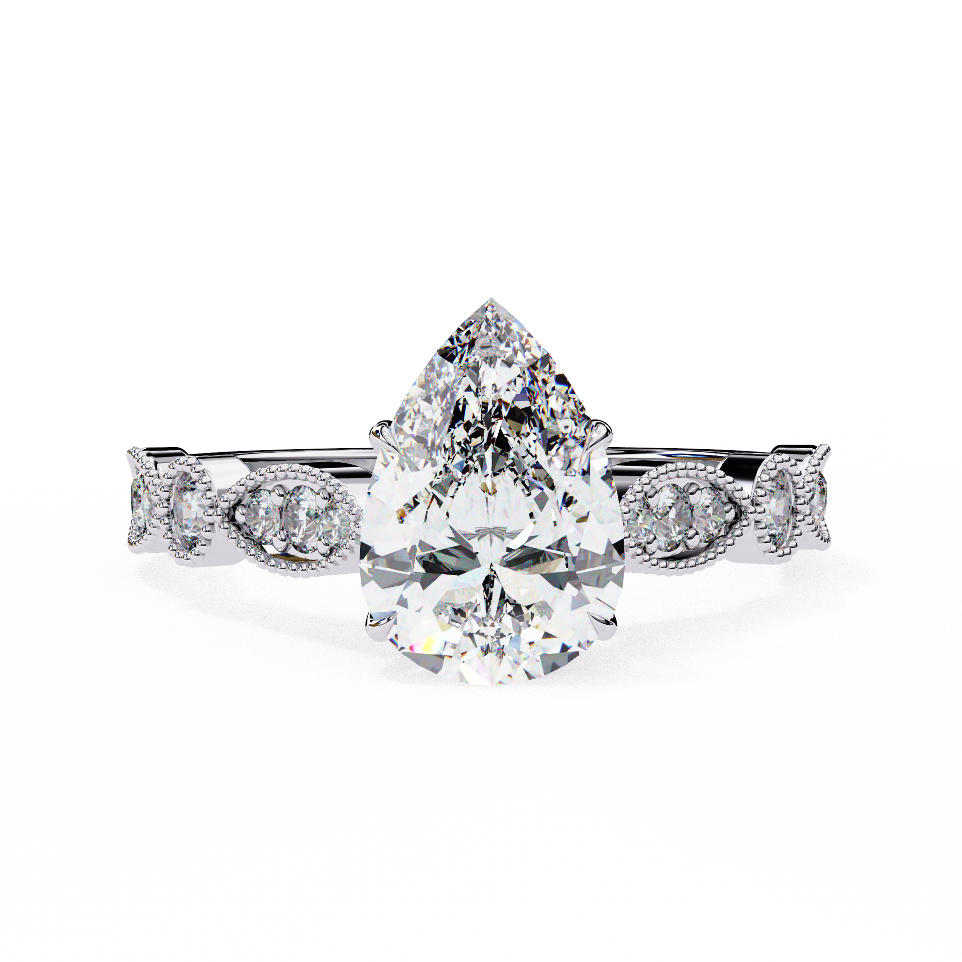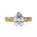 A symbol of elegance and romance, this Pear Cut Diamond Engagement Ring blends brilliance and sophistication. Featuring a 1.00 Ct IGI certified pear diamond of E/F color and VVS/VS clarity, it is enhanced with 0.30 Ct sparkling side diamonds on a vintage-inspired band, creating a design that captures timeless beauty.