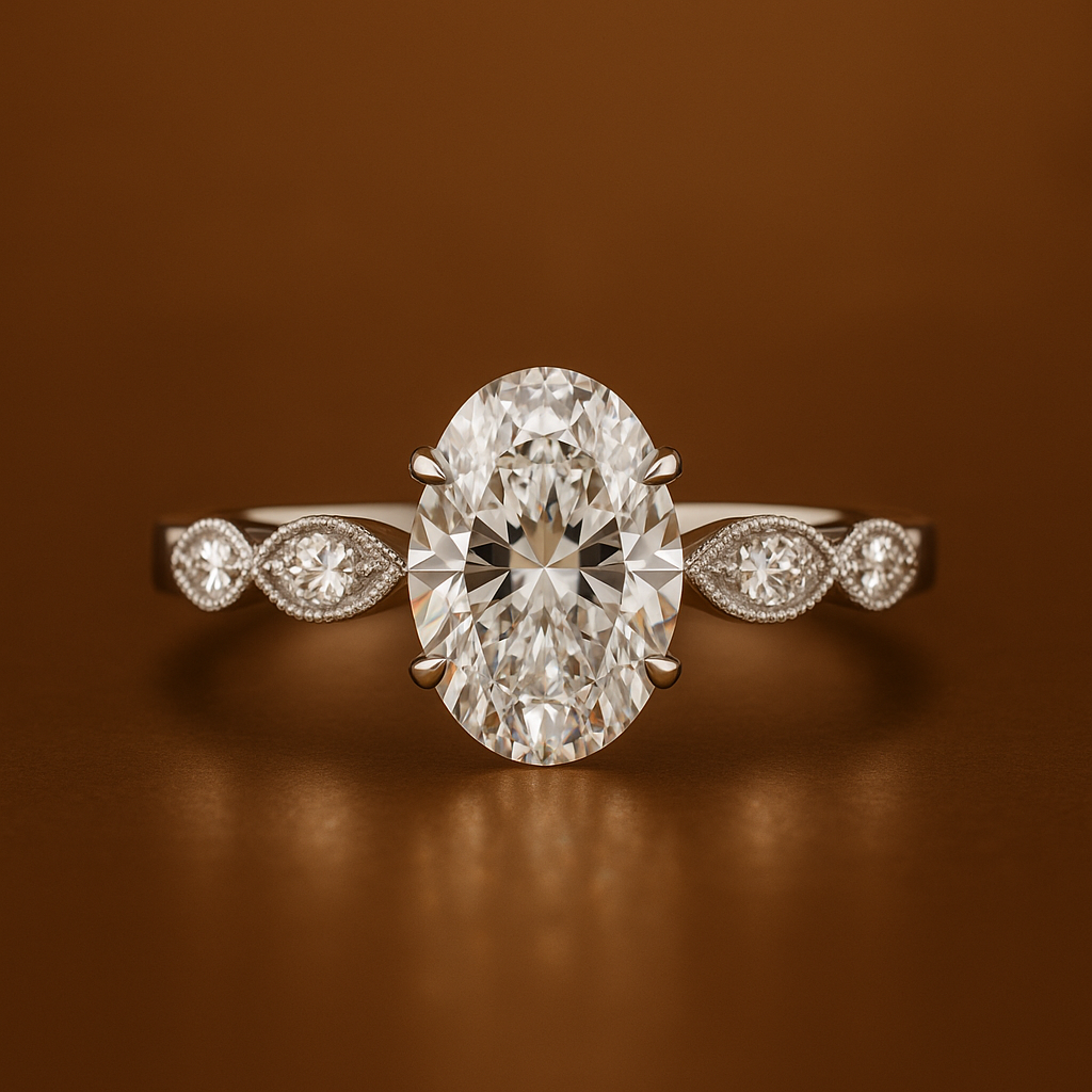 This breathtaking Oval Cut Diamond Ring radiates elegance and brilliance. Featuring a 1.20 Ct IGI certified oval diamond of E/F color and VVS/VS clarity, it is beautifully enhanced with 0.25 Ct side diamonds set along a vintage-inspired band, making it the perfect choice for engagements, anniversaries, or milestone moments.