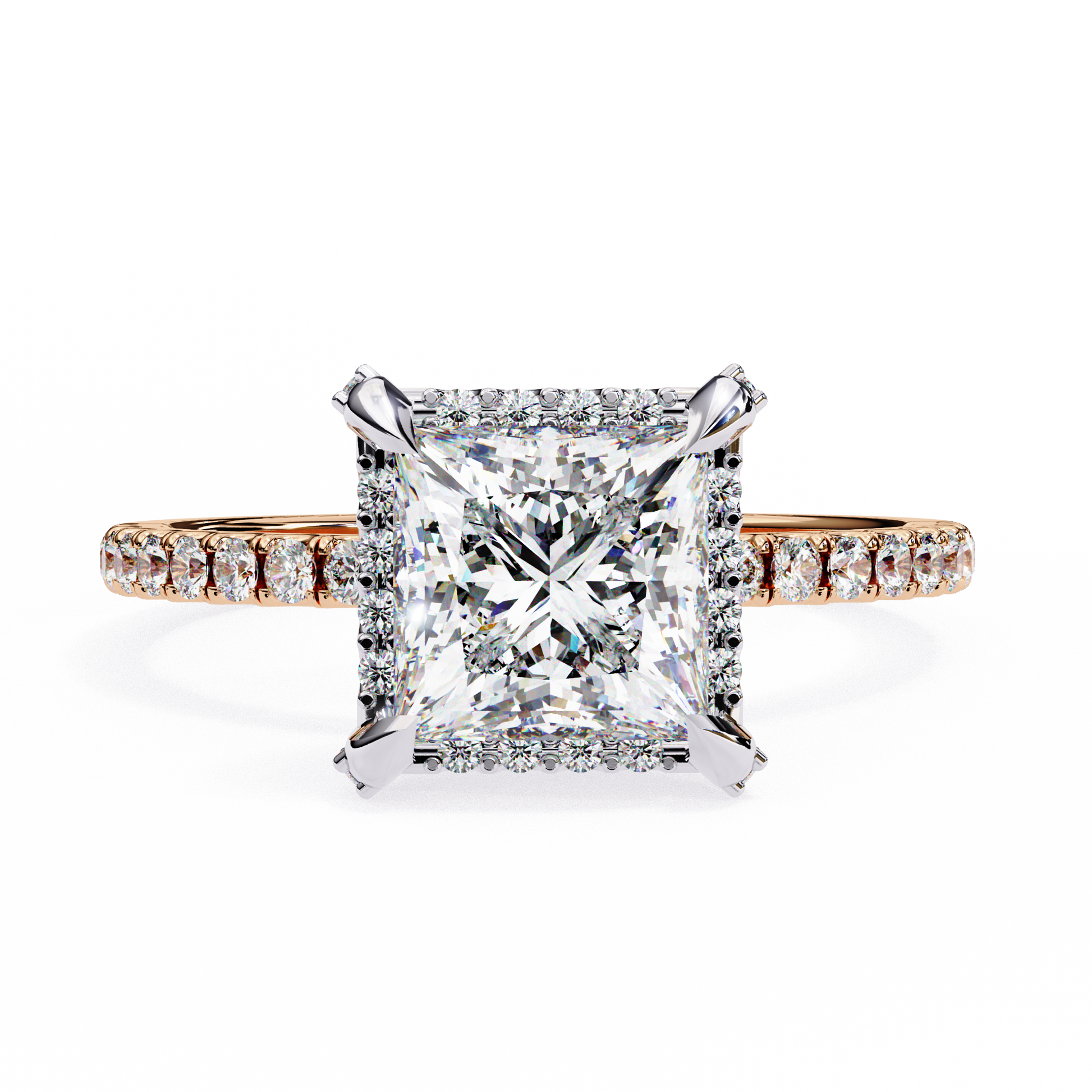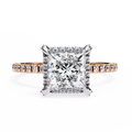Shop our 2.00 Ct Princess Cut Halo Diamond Engagement Ring, IGI Certified with E/F Color & VVS/VS Clarity. Pavé band design, available in Silver, 14K & 18K Gold. Worldwide secure shipping.