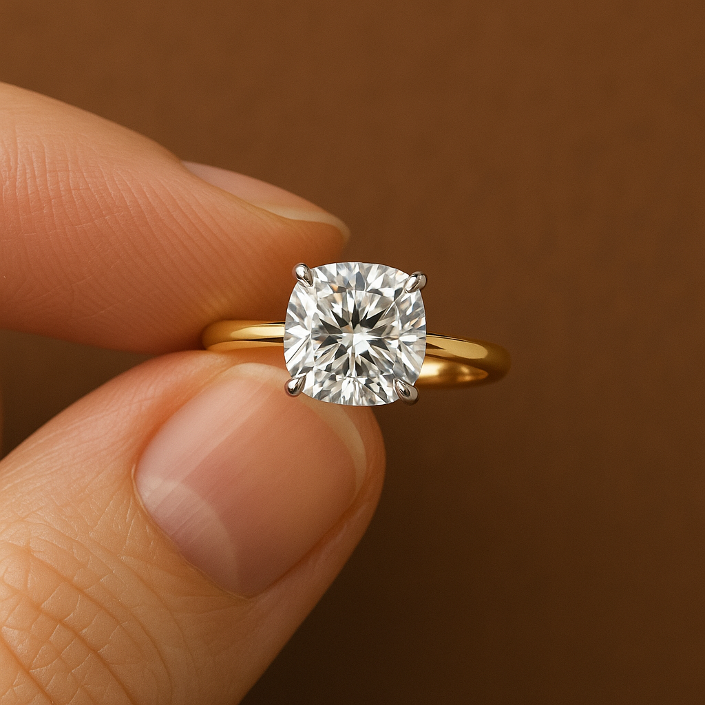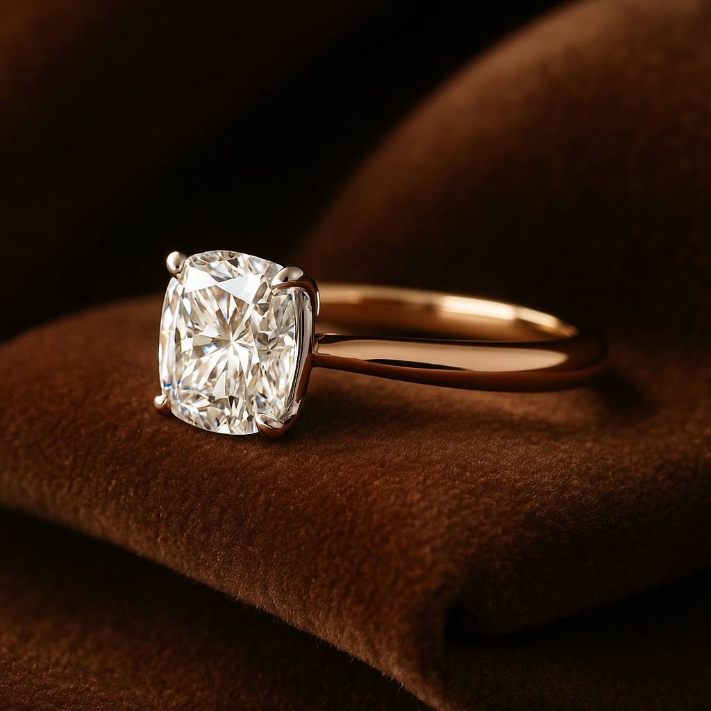 Timeless elegance meets modern brilliance. This ring showcases a 2.50 Carat IGI-certified cushion cut lab grown diamond of E/F color and VVS/VS clarity—a perfect blend of fire, sparkle, and sophistication. Its soft square silhouette with rounded corners makes it a beloved classic for engagements and special milestones.