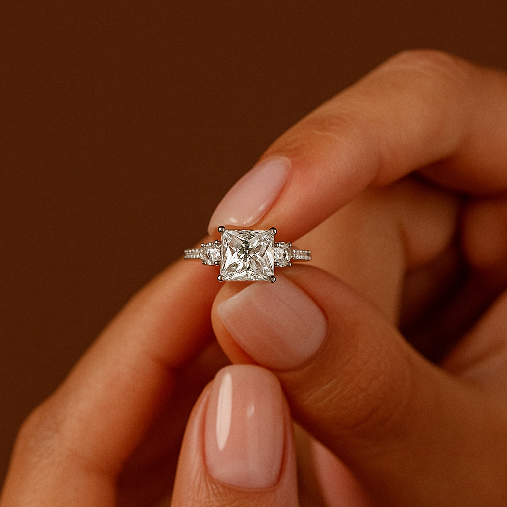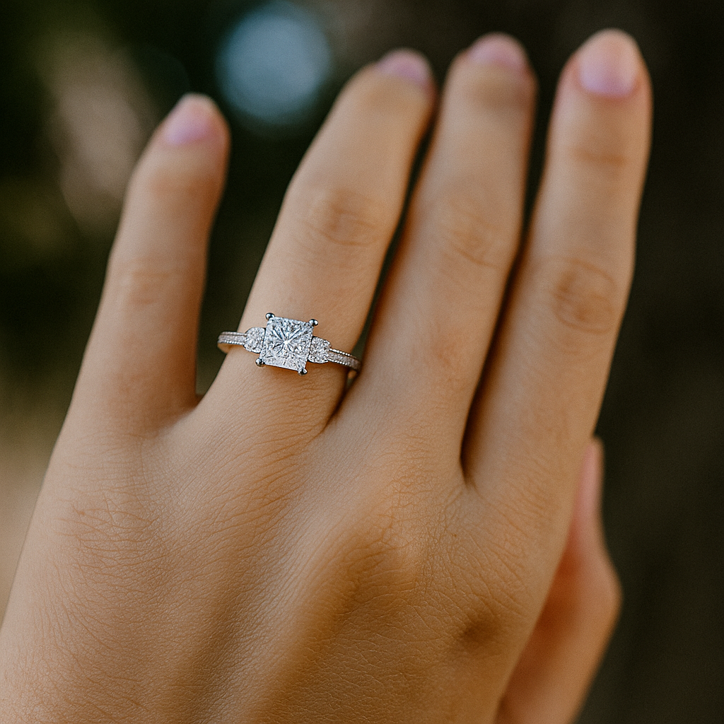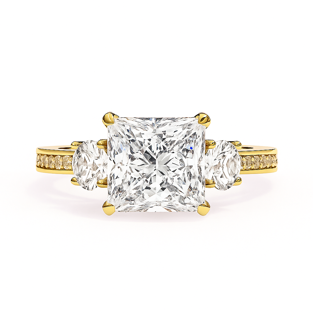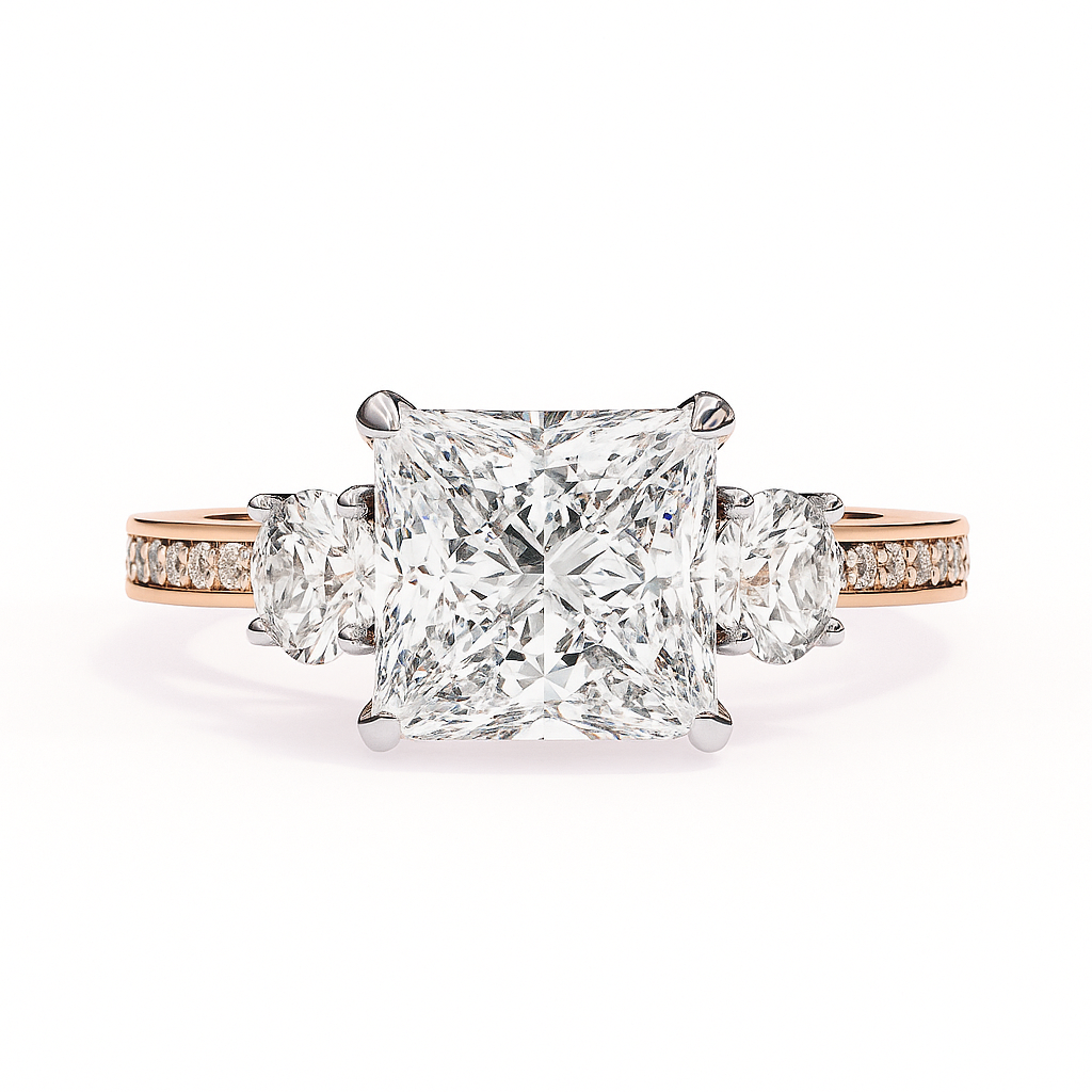 2.50 Ct Princess Cut Diamond Engagement Ring with Round Side Stones – IGI Certified | Luxe Three-Stone Design