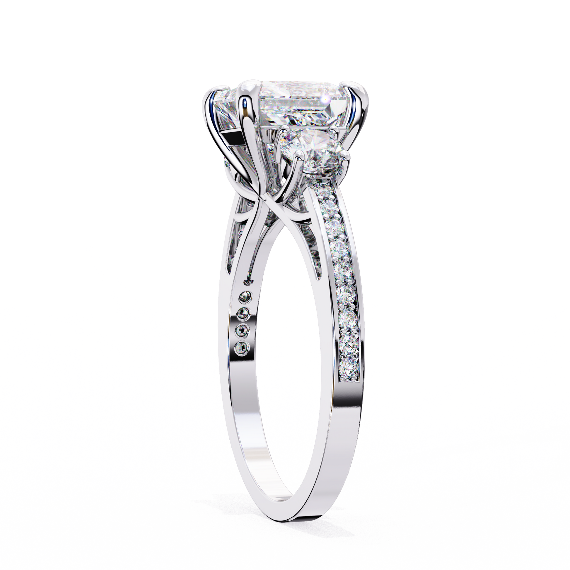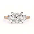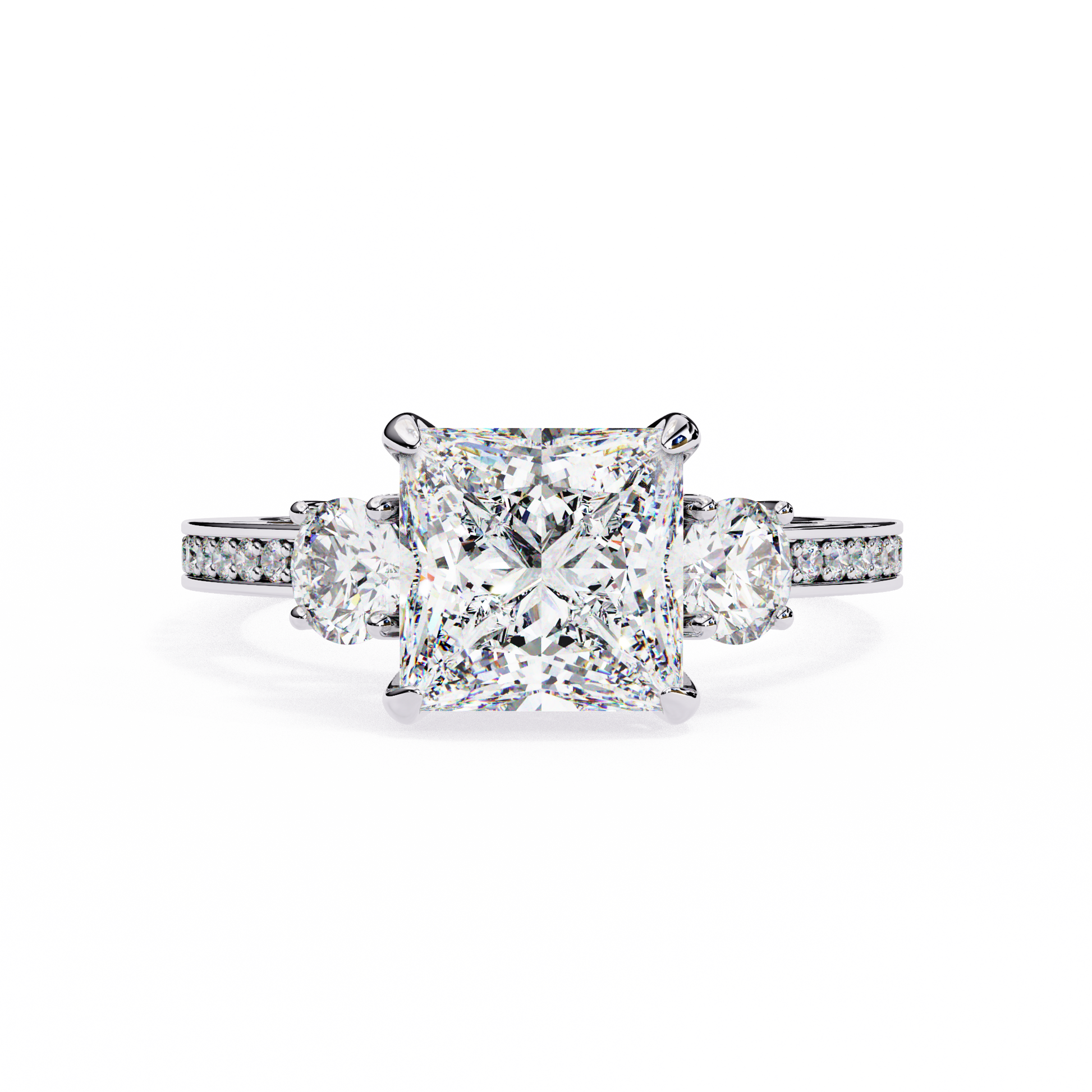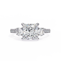 Classic brilliance meets modern sophistication in this Princess Cut Diamond Engagement Ring, crafted to perfection for everlasting beauty. With a striking 2.50 Carat IGI Certified Princess Diamond at the center, enhanced by 0.25 Ct Round Diamonds on each side and additional 0.25 Ct pavé-set stones, this three-stone design symbolizes past, present, and future love.