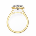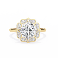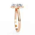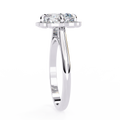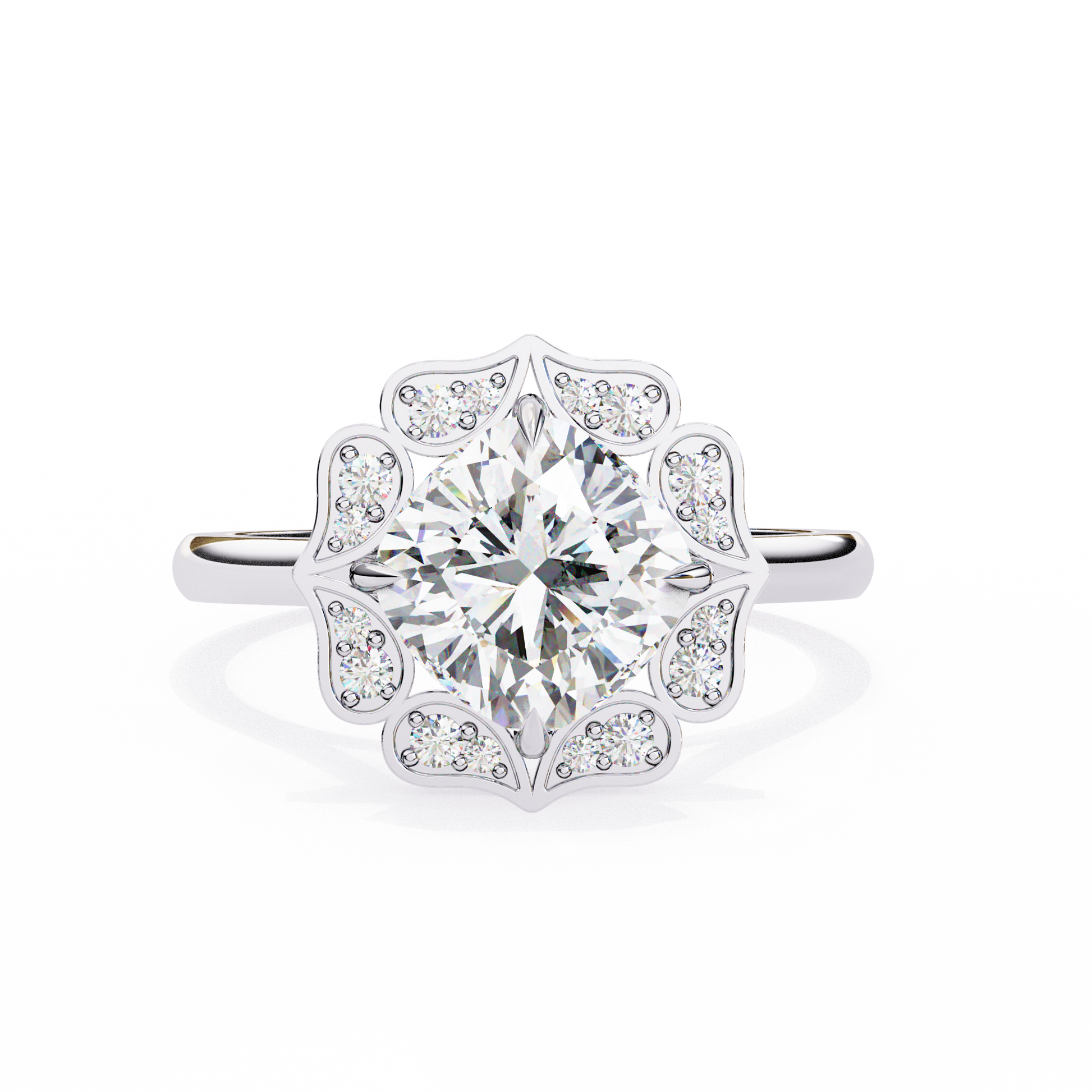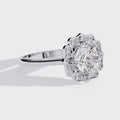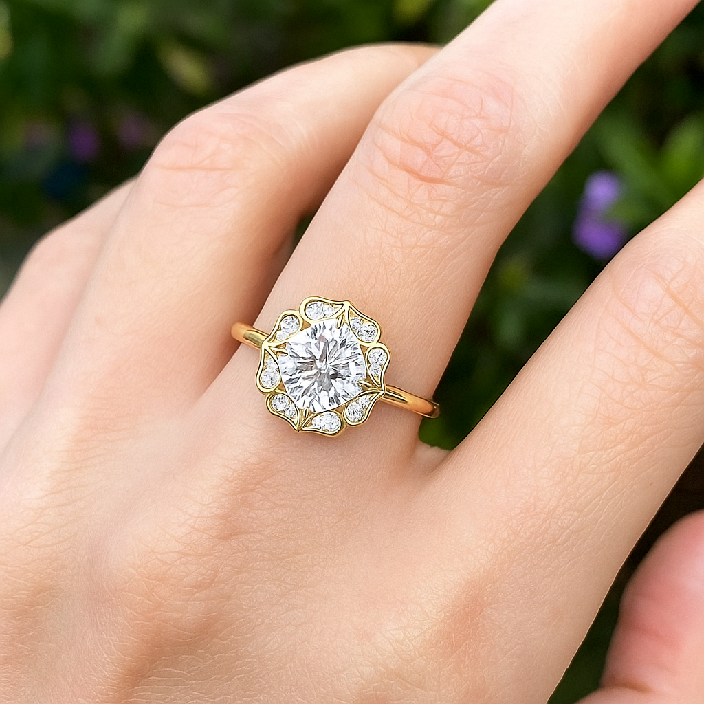 A bold fusion of luxury and artistry, this 3.35 Carat Cushion Cut Diamond Engagement Ring is surrounded by a lotus petal-inspired halo with 0.30 Ct round diamonds. Its fluid curves and petal motifs create a romantic, symbolic design that represents beauty, love, and new beginnings.