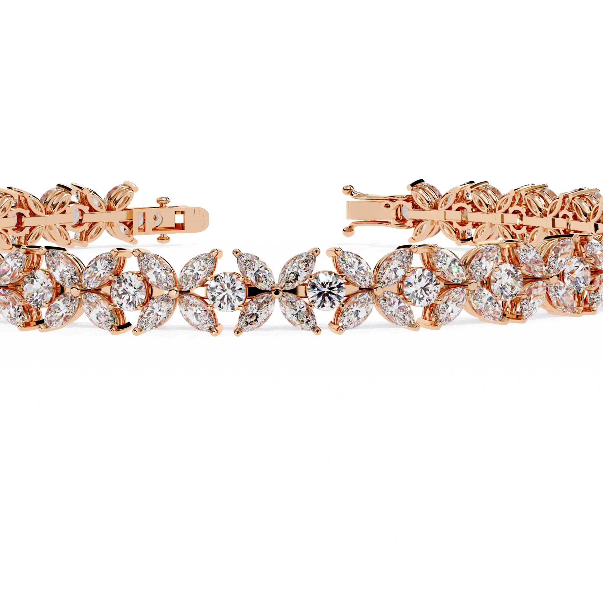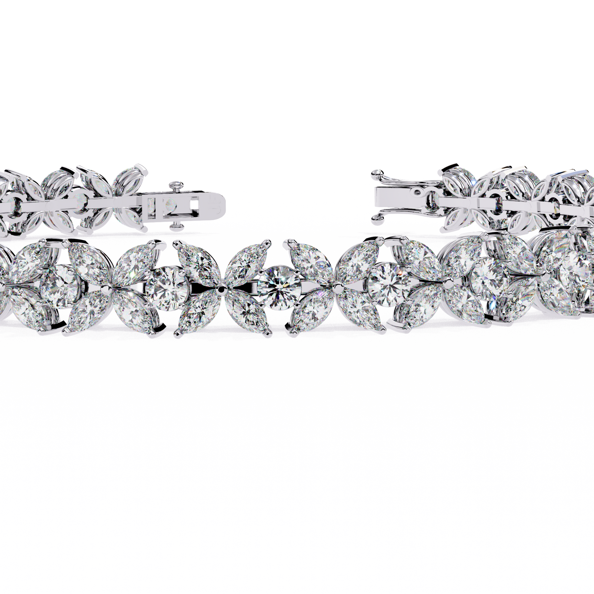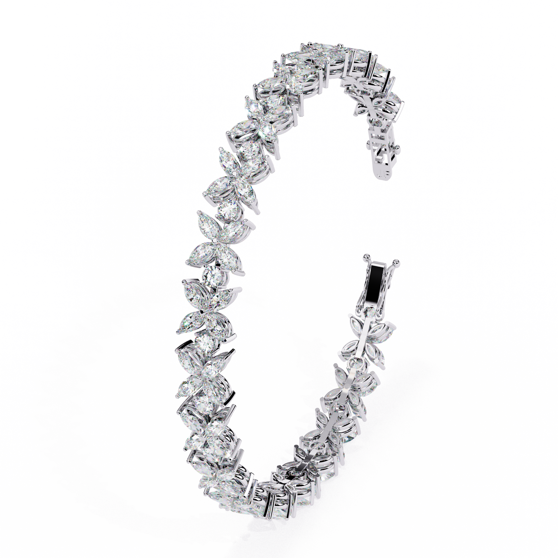 A breathtaking combination of marquise and round diamonds arranged in a flowing floral pattern, creating maximum brilliance and sparkle from every angle. The intricate setting enhances each stone’s fire, making this bracelet a true statement of luxury and sophistication.