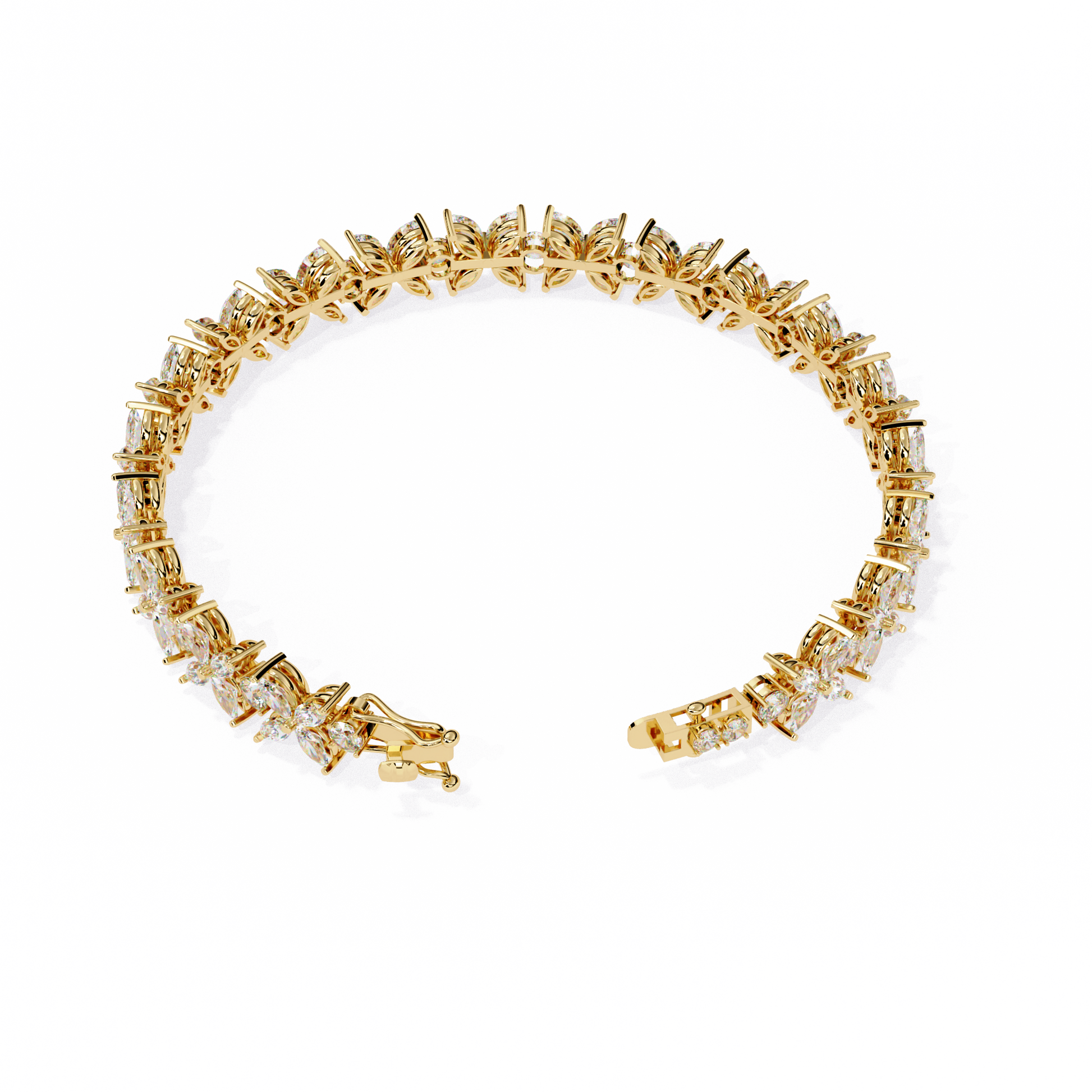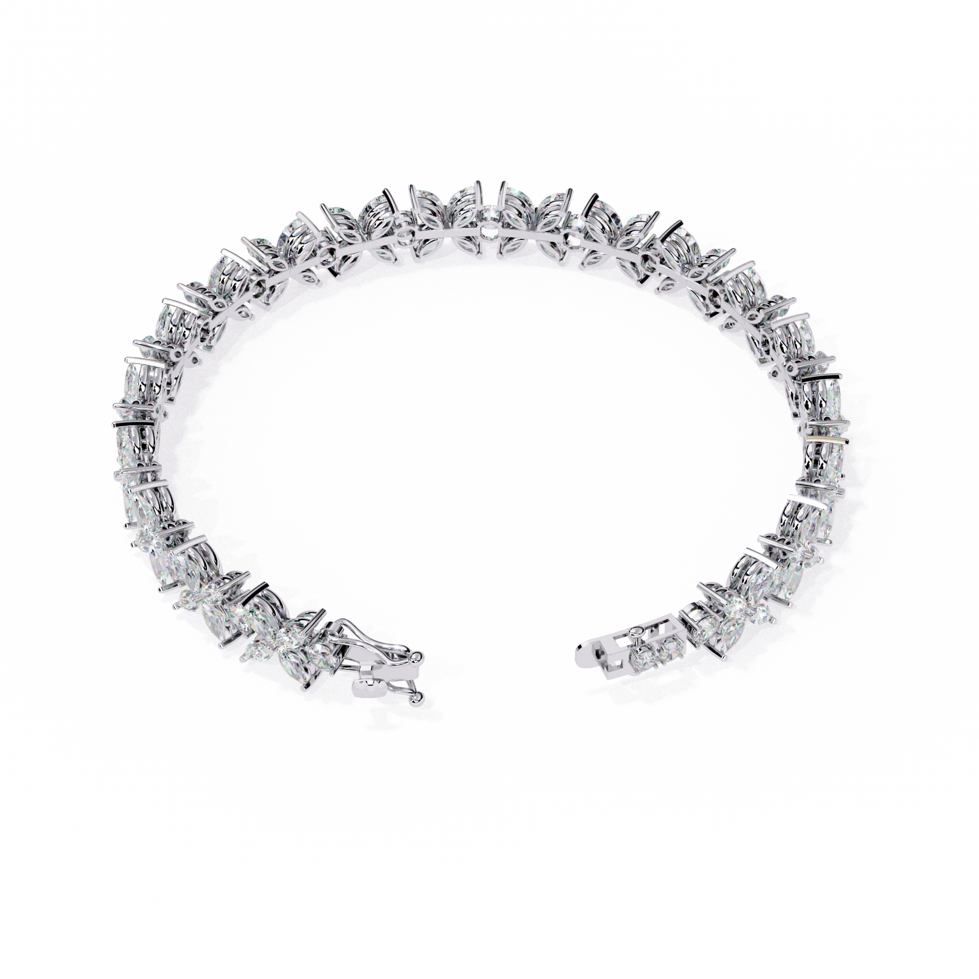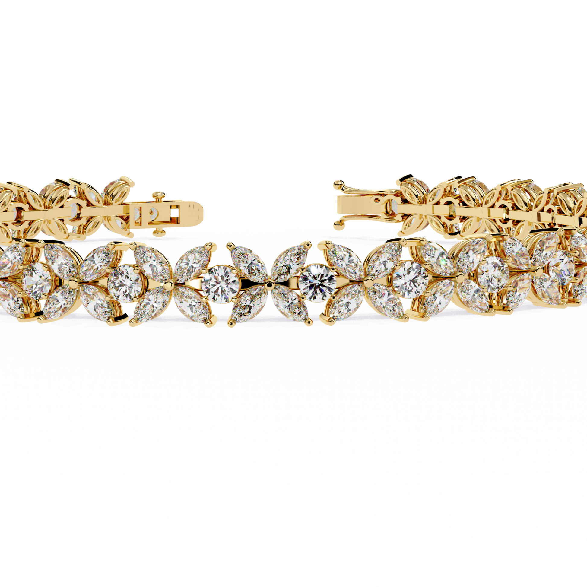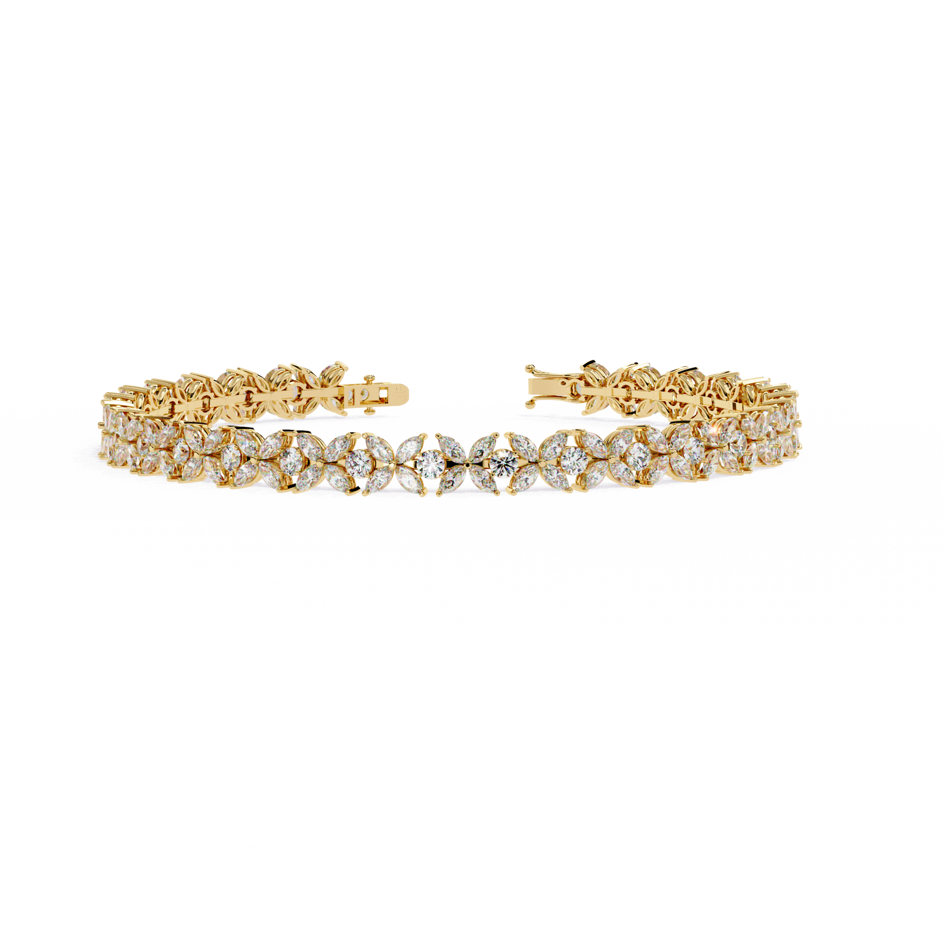 A breathtaking combination of marquise and round diamonds arranged in a flowing floral pattern, creating maximum brilliance and sparkle from every angle. The intricate setting enhances each stone’s fire, making this bracelet a true statement of luxury and sophistication.
