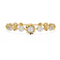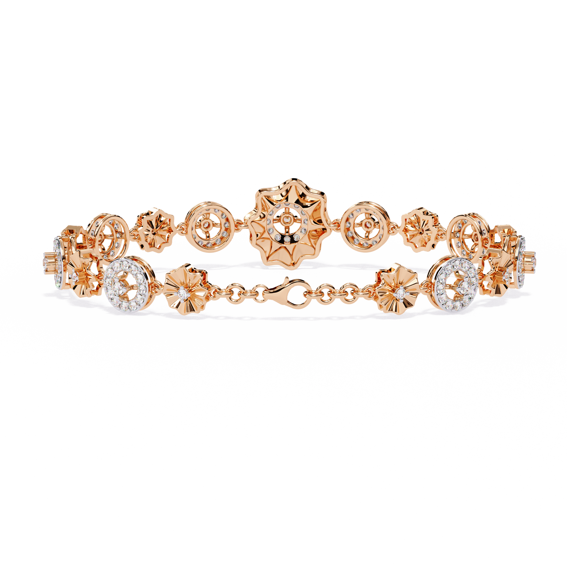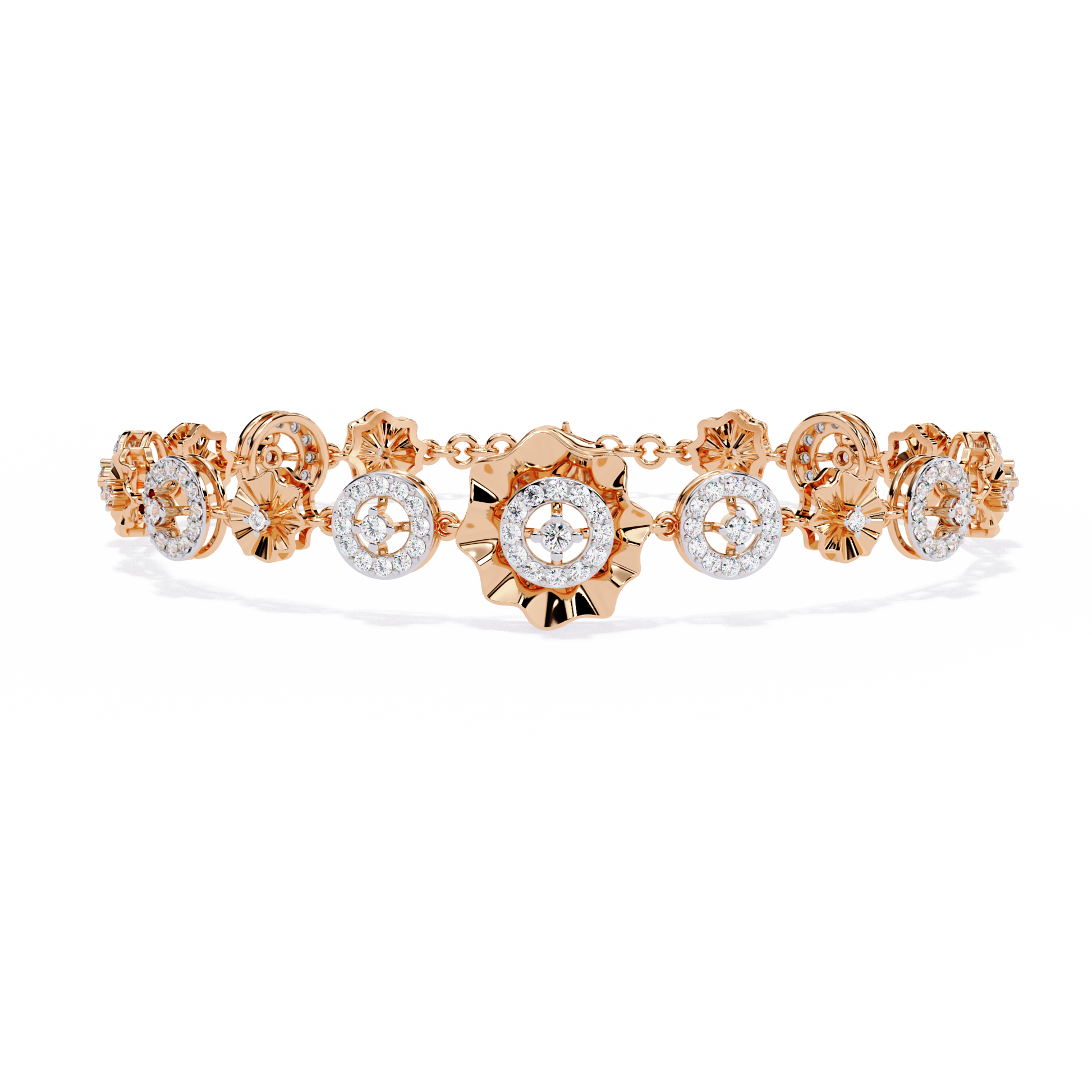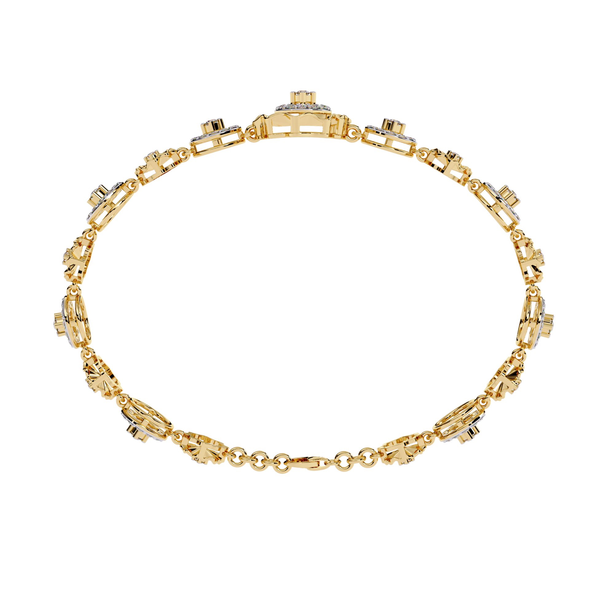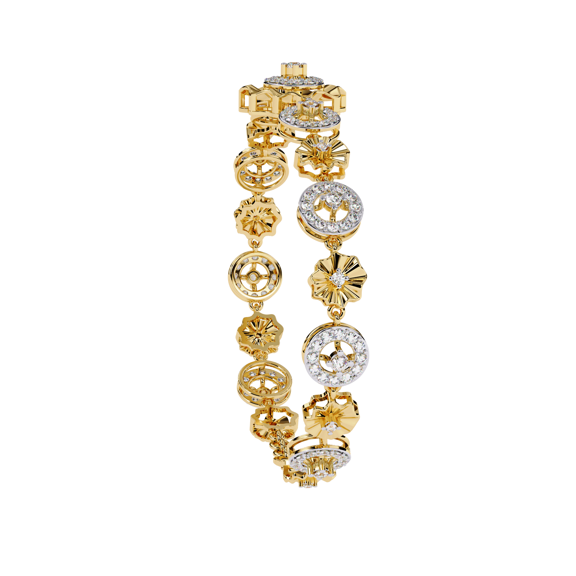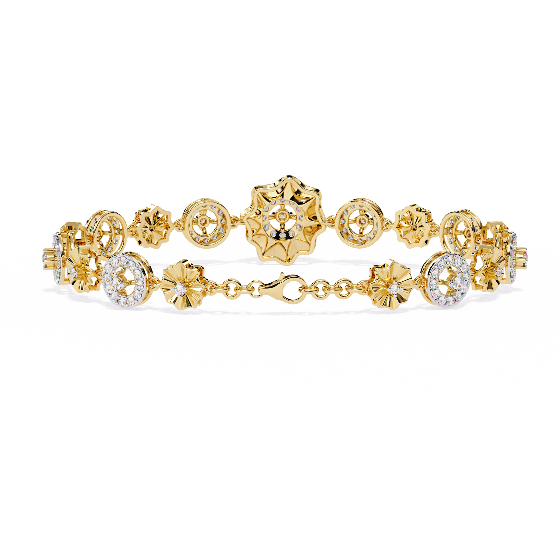 The bracelet features repeating flower-inspired diamond motifs, where polished gold petals surround brilliant diamonds, giving the piece a soft yet luxurious look. The openwork floral design adds depth and lightness, making the bracelet eye-catching without being heavy.